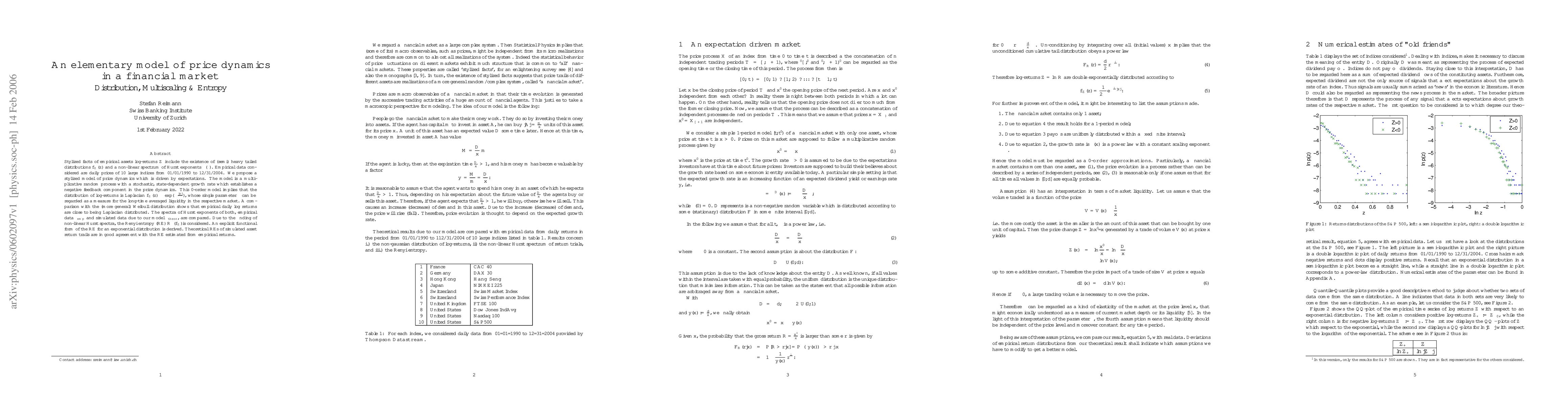 Stylized facts of empirical assets log-returns $Z$ include the existence of (semi) heavy tailed distributions $f_Z(z)$ and a non-linear spectrum of Hurst exponents $\tau(\beta)$. Empirical data considered are daily prices of 10 large indices from 01/01/1990 to 12/31/2004. We propose a stylized model of price dynamics which is driven by expectations. The model is a multiplicative random process with a stochastic, state-dependent growth rate which establishes a negative feedback component in the price dynamics. This 0-order model implies that the distribution of log-returns is Laplacian $f_Z(z) \sim \exp(-\frac{|z|}{\alpha})$, whose single parameter $\alpha$ can be regarded as a measure for the long-time averaged liquidity in the respective market. A comparison with the (more general) Weibull distribution shows that empirical daily log returns are close to being Laplacian distributed. The spectra of Hurst exponents of both, empirical data $\tau_{emp}$ and simulated data due to our model $\tau_{theor}$, are compared. Due to the finding of non-linear Hurst spectra, the Renyi entropy (RE) $R_\beta(f_Z)$is considered. An explicit functional form of the RE for an exponential distribution is derived. Theoretical REs of simulated asset return trails are in good agreement with the RE estimated from empirical returns.