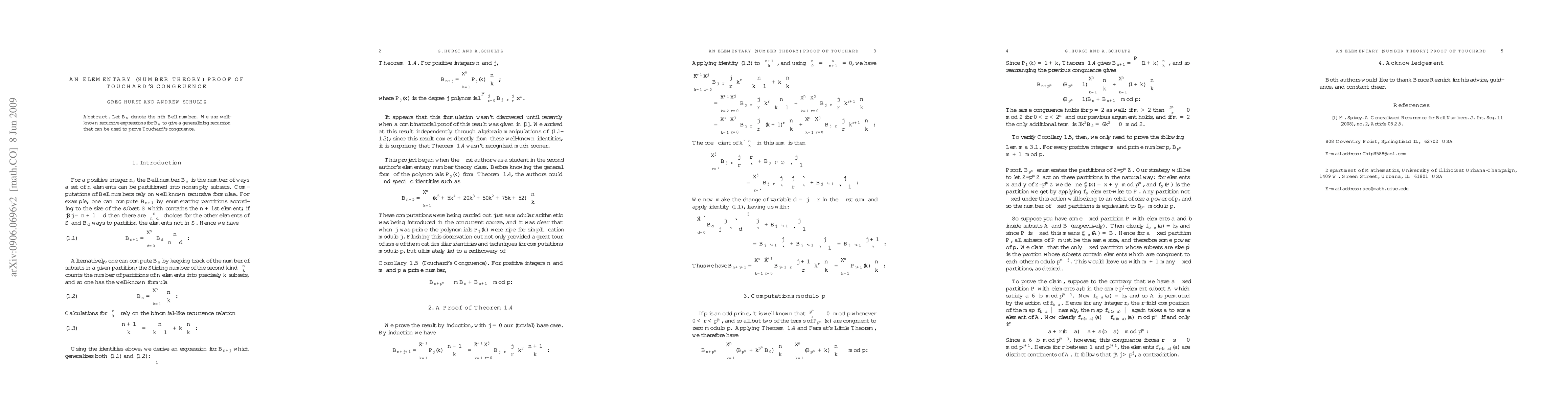 Summary: This paper presents an elementary number theory proof for Touchard's congruence using recursive expressions for Bell numbers, B_n, to establish a generalizing recursion. The proof provides a straightforward approach to understanding the congruence relation.