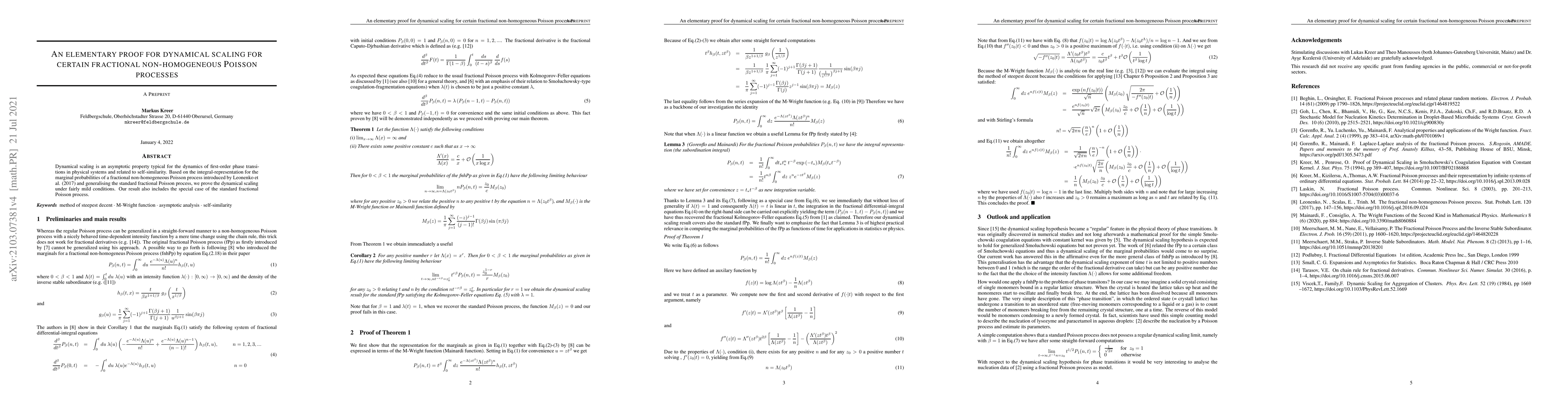 This paper provides an elementary proof for dynamical scaling in fractional non-homogeneous Poisson processes, generalizing the standard fractional Poisson process. The proof leverages an integral-representation for marginal probabilities and applies under mild conditions, including the special case of the standard fractional Poisson process.