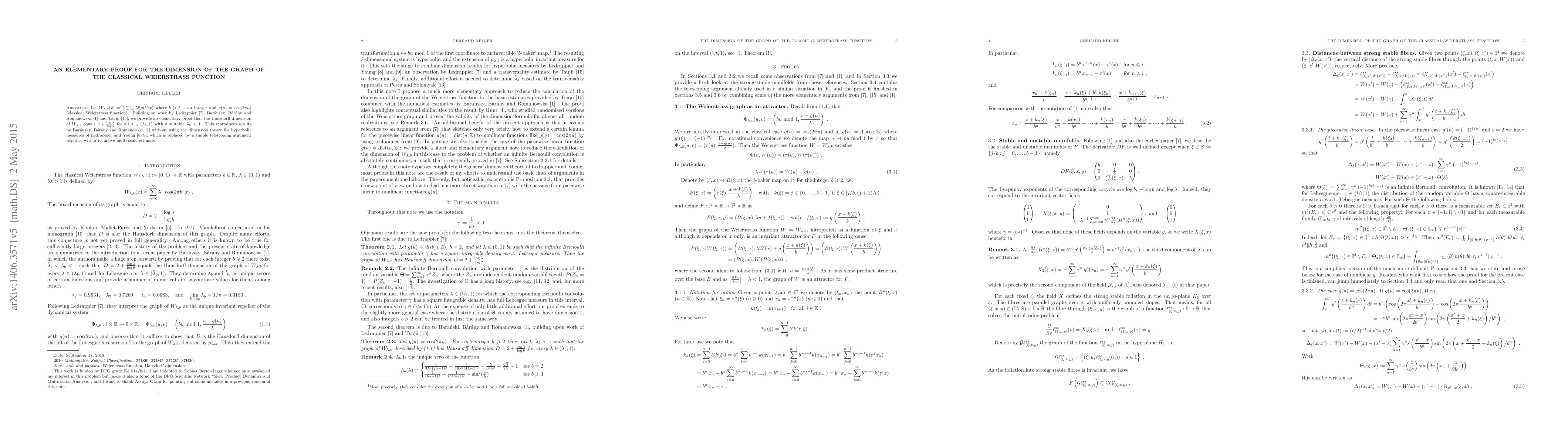 This paper provides an elementary proof for the Hausdorff dimension of the graph of the classical Weierstrass function, showing it equals $2+\frac{\log\lambda}{\log b}$ for $\lambda\in(\lambda_b,1)$, using a telescoping argument and recursive multi-scale estimates instead of complex dimension theory.