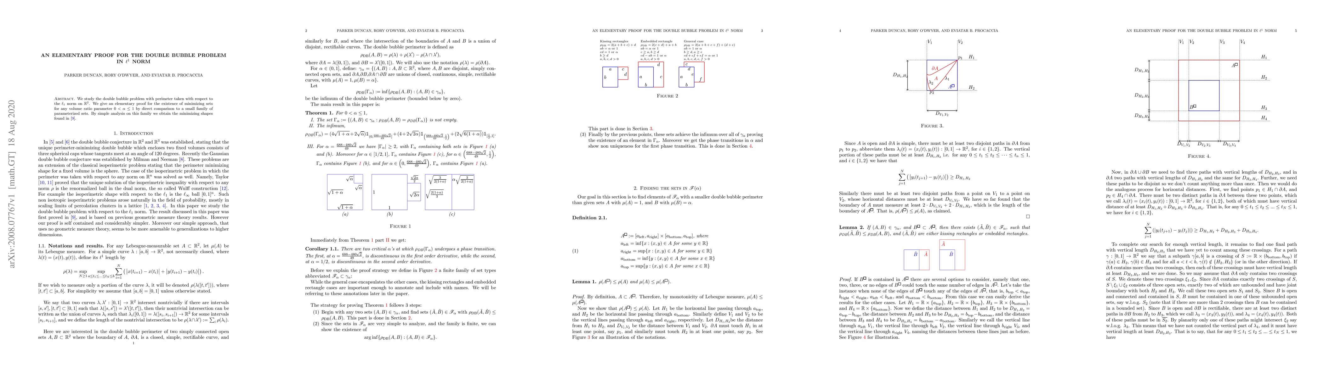Researchers prove the existence of minimizing shapes for the double bubble problem in 2D with respect to the $\ell_1$ norm, using a simple comparison to a parameterized family of sets and confirming earlier findings.