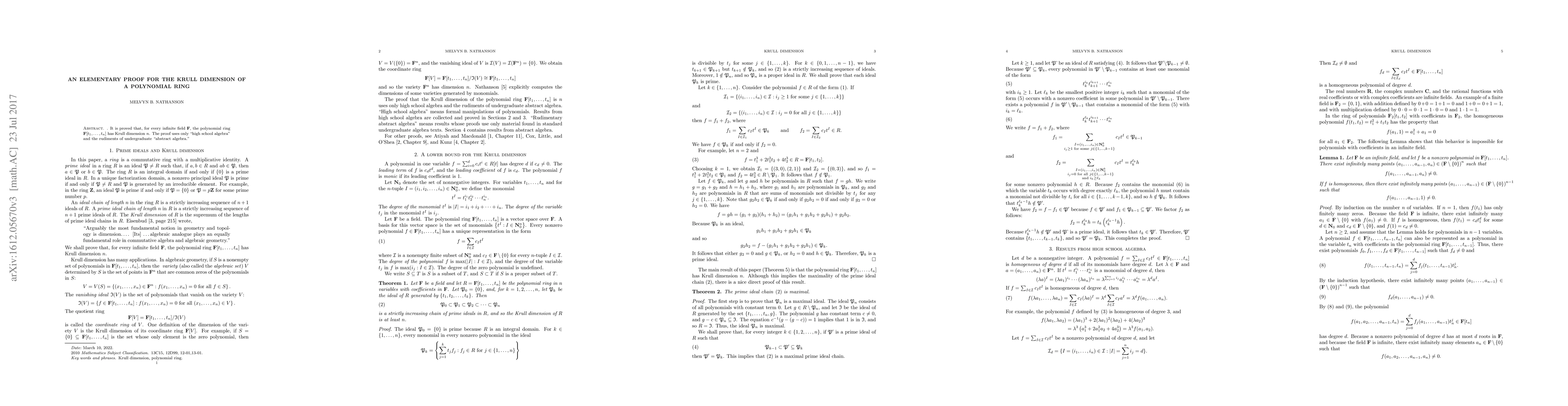 This is an expository paper in which it is proved that, for every infinite field ${\mathbf{F}}$, the polynomial ring ${\mathbf{F}}[t_1,\ldots, t_n]$ has Krull dimension $n$. The proof uses only "high school algebra" and the rudiments of undergraduate "abstract algebra."
