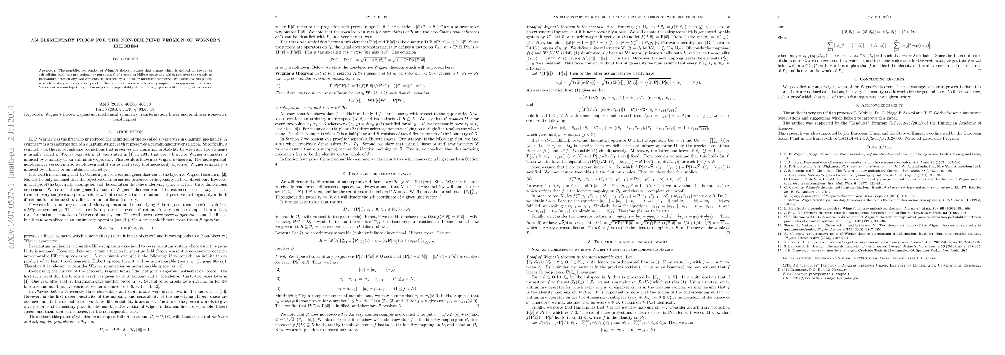 The non-bijective version of Wigner's theorem states that a map which is defined on the set of self-adjoint, rank-one projections (or pure states) of a complex Hilbert space and which preserves the transition probability between any two elements, is induced by a linear or antilinear isometry. We present a completely new, elementary and very short proof of this famous theorem which is very important in quantum mechanics. We do not assume bijectivity of the mapping or separability of the underlying space like in many other proofs.