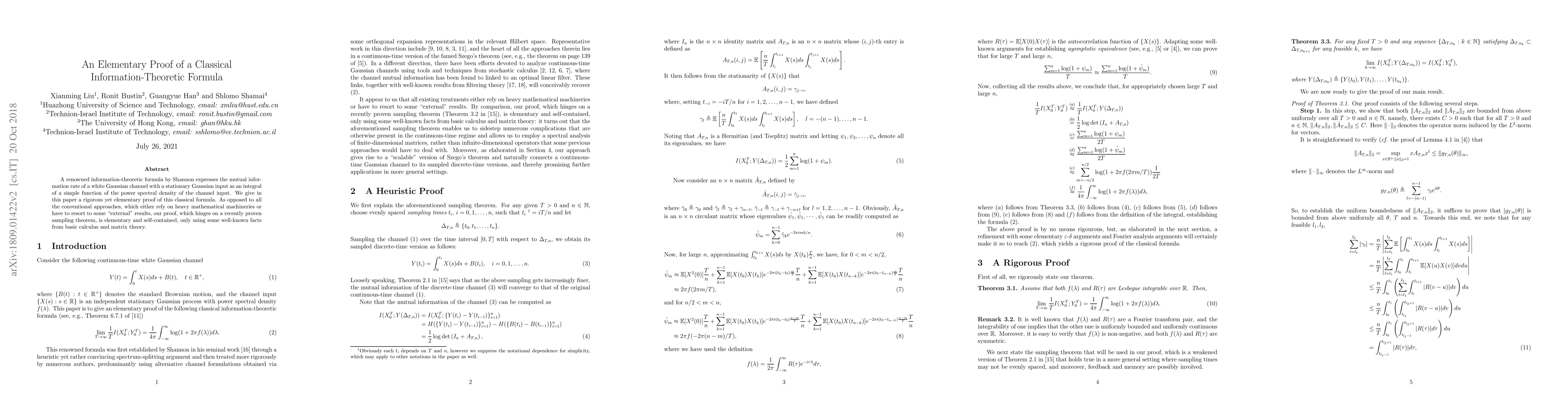 A renowned information-theoretic formula by Shannon expresses the mutual information rate of a white Gaussian channel with a stationary Gaussian input as an integral of a simple function of the power spectral density of the channel input. We give in this paper a rigorous yet elementary proof of this classical formula. As opposed to all the conventional approaches, which either rely on heavy mathematical machineries or have to resort to some "external" results, our proof, which hinges on a recently proven sampling theorem, is elementary and self-contained, only using some well-known facts from basic calculus and matrix theory.