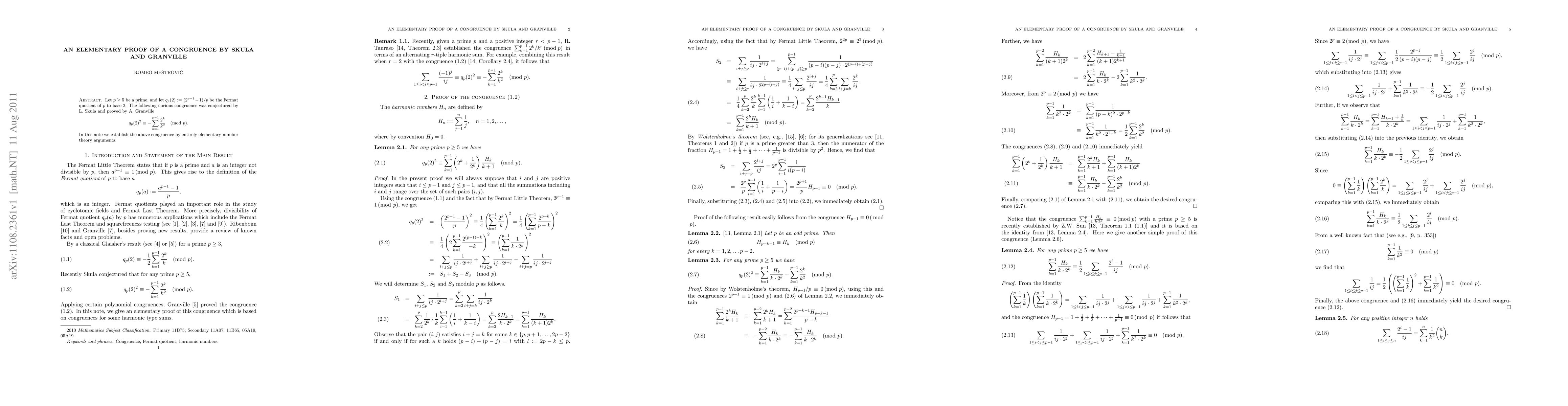 This paper provides an elementary proof for the congruence conjectured by L. Skula and proved by A. Granville: $q_p(2)^2 \equiv -\sum_{k=1}^{p-1}\frac{2^k}{k^2} \pmod{p}$, where $p \ge 5$ is a prime and $q_p(2)$ is the Fermat quotient of $p$ to base 2.