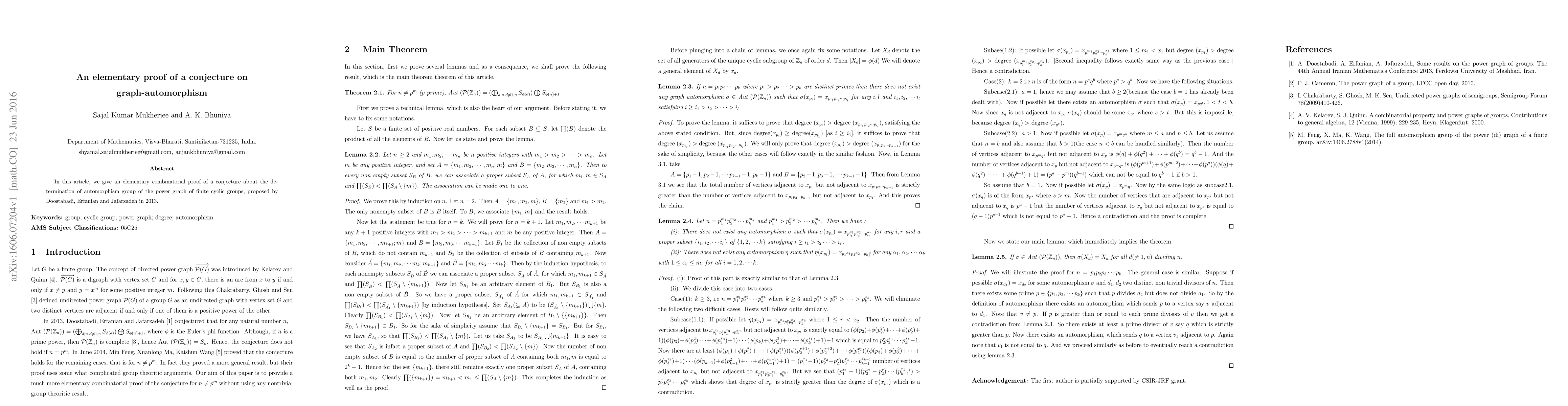 In this article, we give an elementary combinatorial proof of a conjecture about the determination of automorphism group of the power graph of finite cyclic groups, proposed by Doostabadi, Erfanian and Jafarzadeh in 2013.