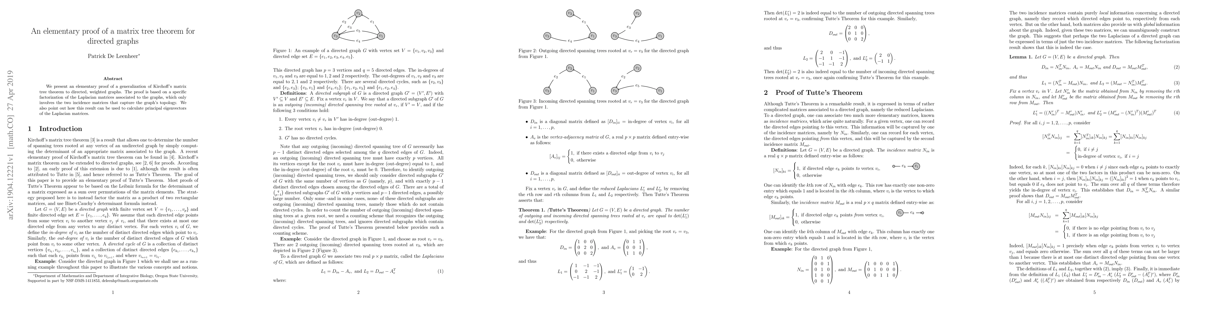 We present an elementary proof of a generalization of Kirchoff's matrix tree theorem to directed, weighted graphs. The proof is based on a specific factorization of the Laplacian matrices associated to the graphs, which only involves the two incidence matrices that capture the graph's topology. We also point out how this result can be used to calculate principal eigenvectors of the Laplacian matrices.