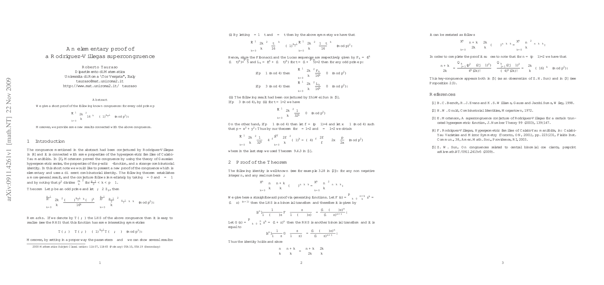The paper presents an elementary proof of a Rodriguez-Villegas supercongruence using a different combinatorial identity, contrasting with previous proofs involving Gaussian hypergeometric series, p-adic Γ-function, and a strange combinatorial identity.