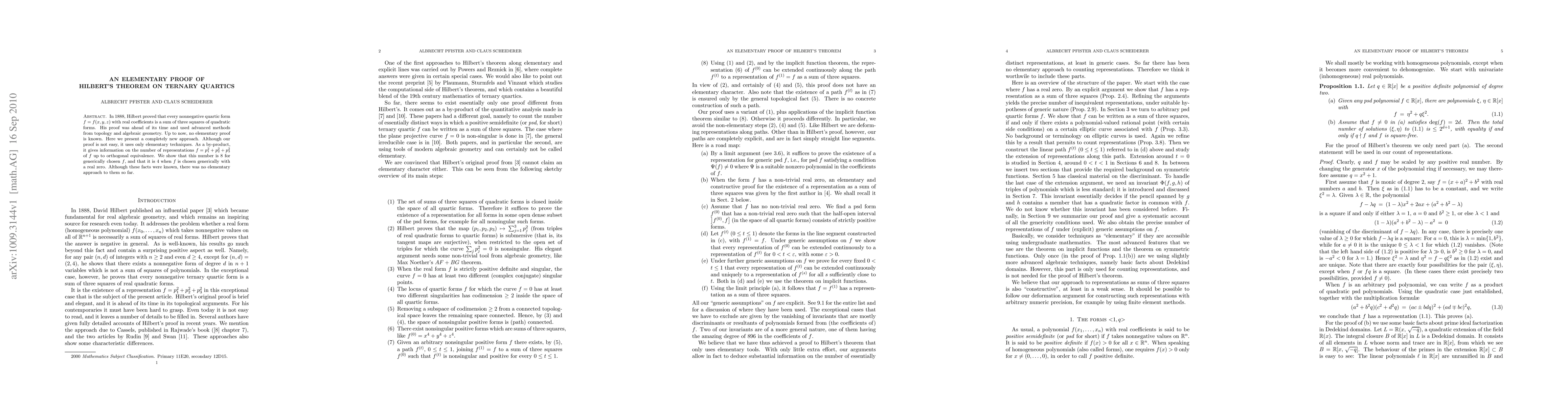 Researchers have developed an elementary proof for Hilbert's theorem on ternary quartics, showing that every non-negative quartic form with real coefficients can be expressed as a sum of three squares of quadratic forms, and providing new insights into the number of representations up to orthogonal equivalence.