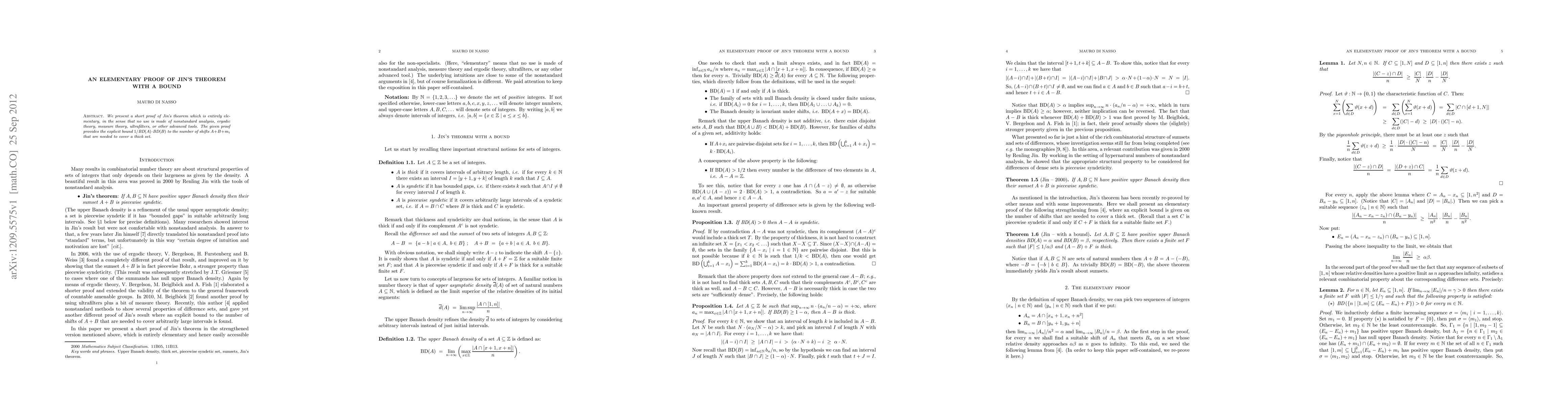 We present a short proof of Jin's theorem which is entirely elementary, in the sense that no use is made of nonstandard analysis, ergodic theory, measure theory, ultrafilters, or other advanced tools. The given proof provides the explicit bound 1/c where c=BD(A)*BD(B) to the number of shifts of A+B that are needed to cover a thick set.