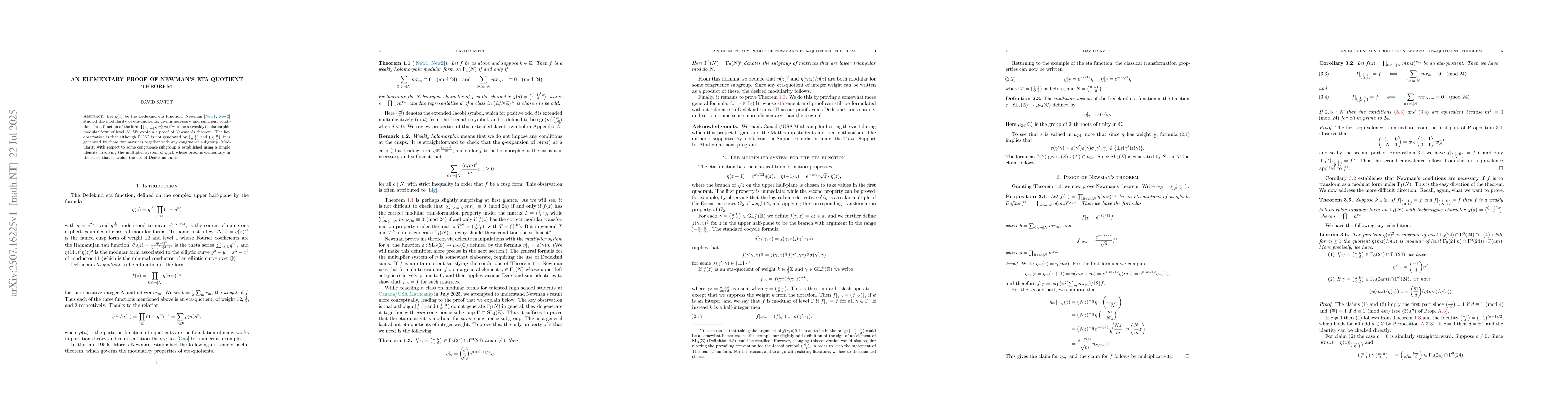 The paper presents an elementary proof of Newman's eta-quotient theorem using a high school level approach, focusing on the transformation properties of the Dedekind eta function and its multiplier system.
