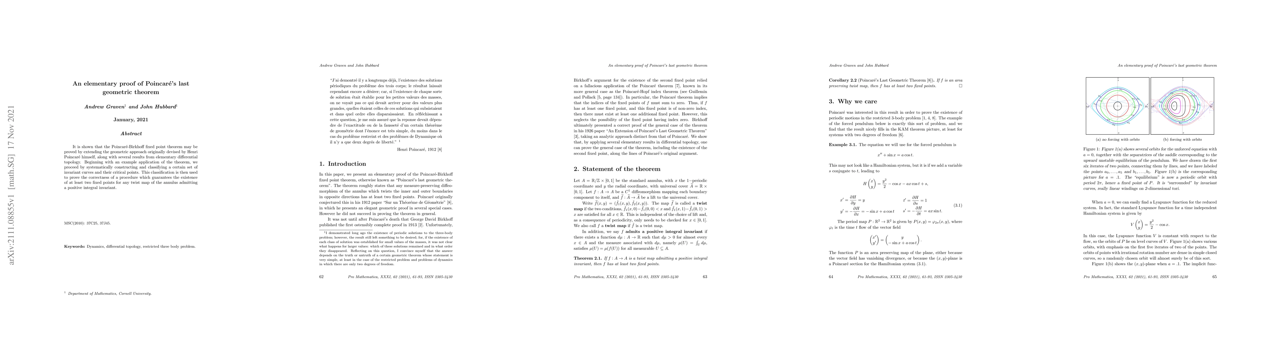 This paper presents an elementary proof of the Poincaré-Birkhoff fixed point theorem using Poincaré’s original geometric approach and elementary differential topology. The proof involves classifying invariant curves and their critical points to demonstrate the existence of at least two fixed points for twist maps of an annulus with positive integral invariant.