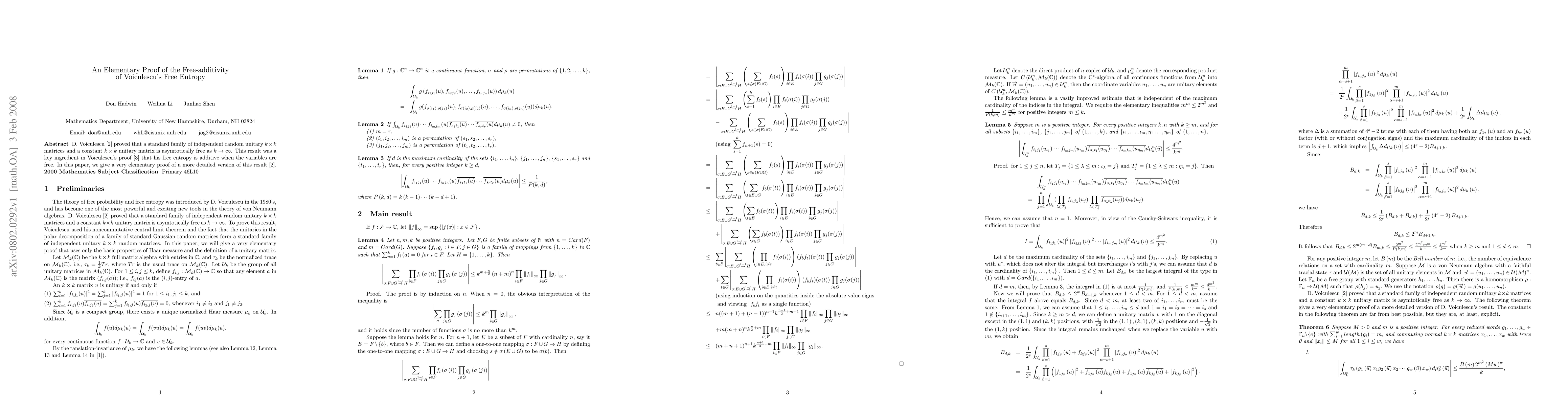 D. Voiculescu [2] proved that a standard family of independent random unitary k by k matrices and a constant k by k unitary matrix is asymtotically free as k goes to infinity. This result was a key ingredient in Voiculescu's proof [3] that his free entropy is additive when the variables are free. In this paper, we give a very elementary proof of a more detailed version of this result [2].