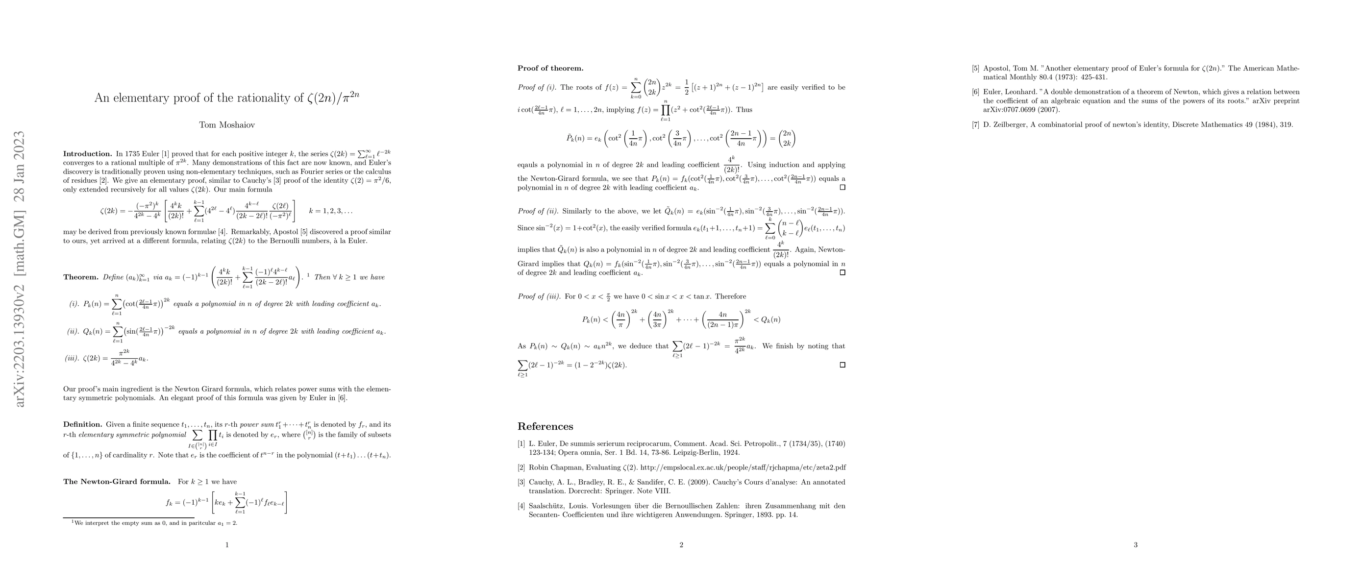 This paper presents an elementary proof for the rationality of $\zeta(2n)/\pi^{2n}$, extending Cauchy's proof for $\zeta(2)$ to all even integers $2k$. The proof uses a recursive formula derived from previously known results, establishing $\zeta(2k)$ as a rational multiple of $\pi^{2k}$.