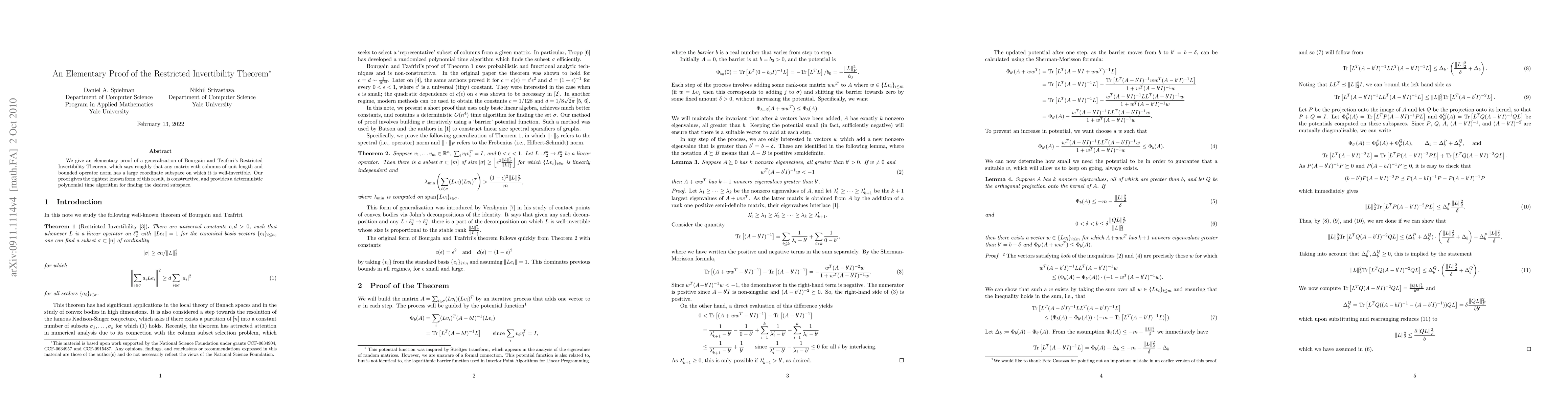 We give an elementary proof of a generalization of Bourgain and Tzafriri's Restricted Invertibility Theorem, which says roughly that any matrix with columns of unit length and bounded operator norm has a large coordinate subspace on which it is well-invertible. Our proof gives the tightest known form of this result, is constructive, and provides a deterministic polynomial time algorithm for finding the desired subspace.