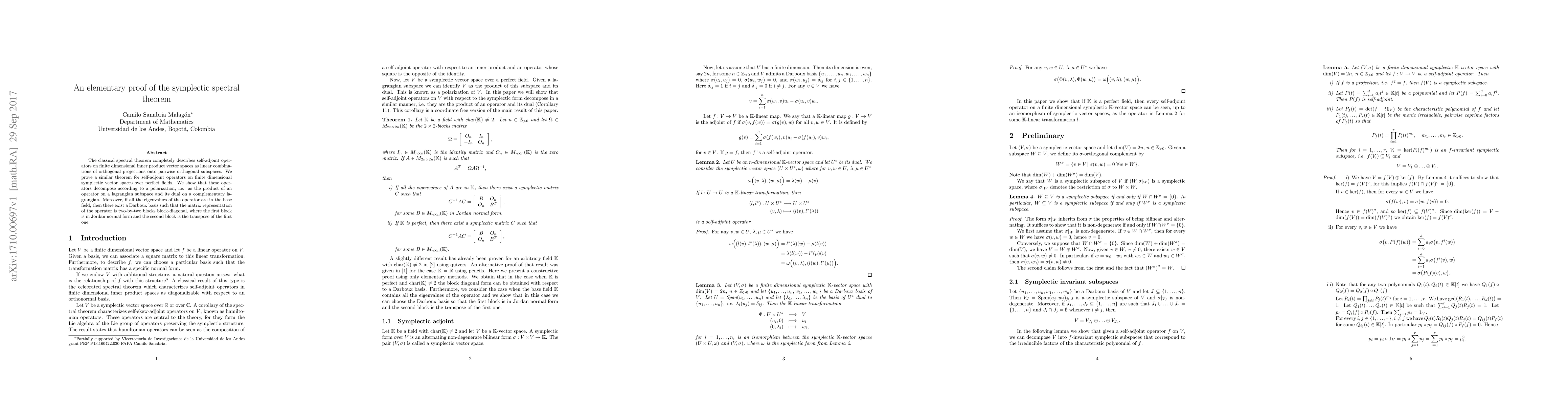 The classical spectral theorem completely describes self-adjoint operators on finite dimensional inner product vector spaces as linear combinations of orthogonal projections onto pairwise orthogonal subspaces. We prove a similar theorem for self-adjoint operators on finite dimensional symplectic vector spaces over perfect fields. We show that these operators decompose according to a polarization, i.e. as the product of an operator on a lagrangian subspace and its dual on a complementary lagrangian. Moreover, if all the eigenvalues of the operator are in the base field, then there exist a Darboux basis such that the matrix representation of the operator is two-by-two blocks block-diagonal, where the first block is in Jordan normal form and the second block is the transpose of the first one.
