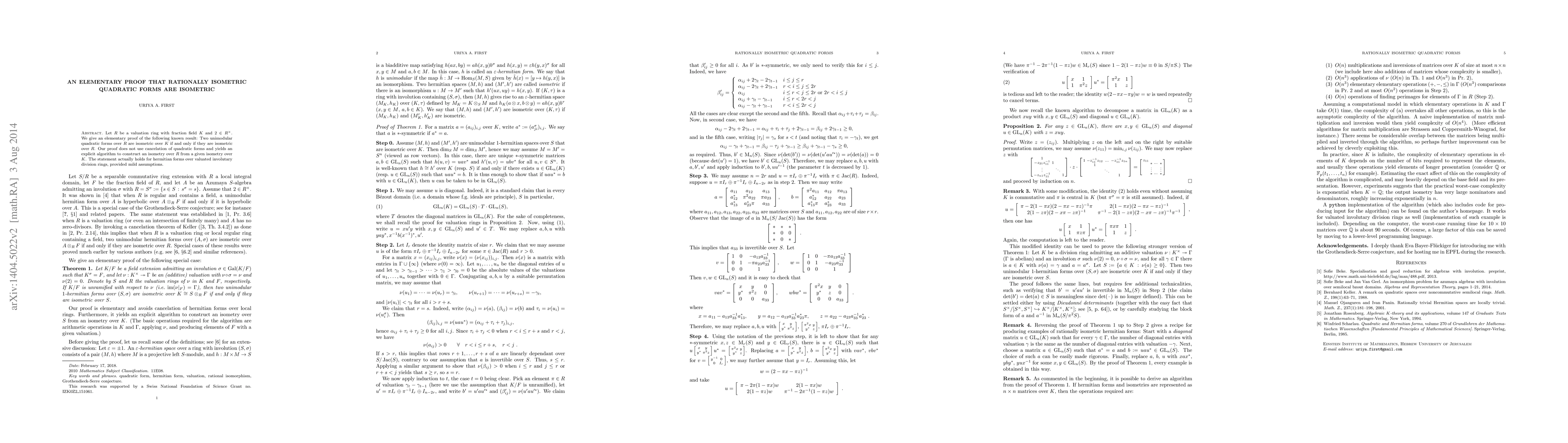 Let $R$ be a valuation ring with fraction field $K$ and $2\in R^\times$. We give an elementary proof of the following known result: Two unimodular quadratic forms over $R$ are isometric over $K$ if and only if they are isometric over $R$. Our proof does not use Witt's Cancelation Theorem and yields an explicit algorithm to construct an isometry over $R$ from a given isometry over $K$. The statement actually holds for hermitian forms over valuated involutary division rings, provided mild assumptions. A python implementation of the algorithm derived from the proof can be found on the author's home page.