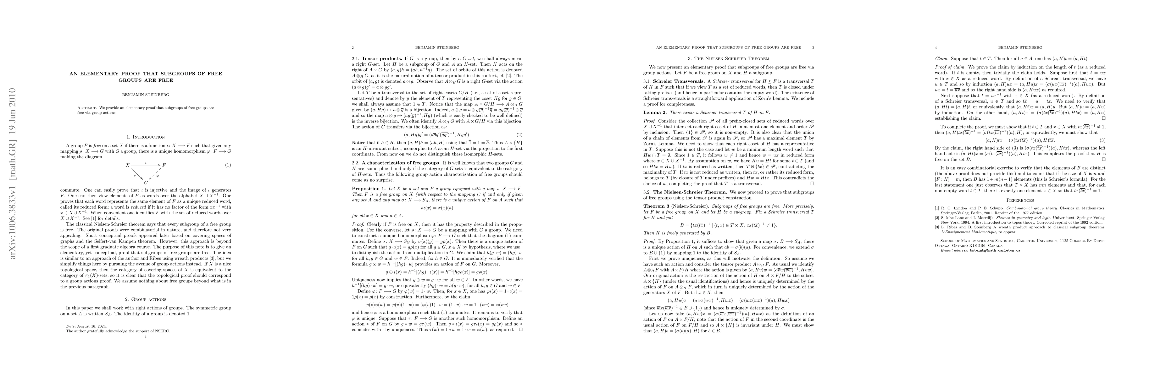 This paper presents an elementary proof that subgroups of free groups are free, utilizing group actions to establish the result without advanced algebraic techniques. The proof emphasizes straightforward group-theoretic methods.