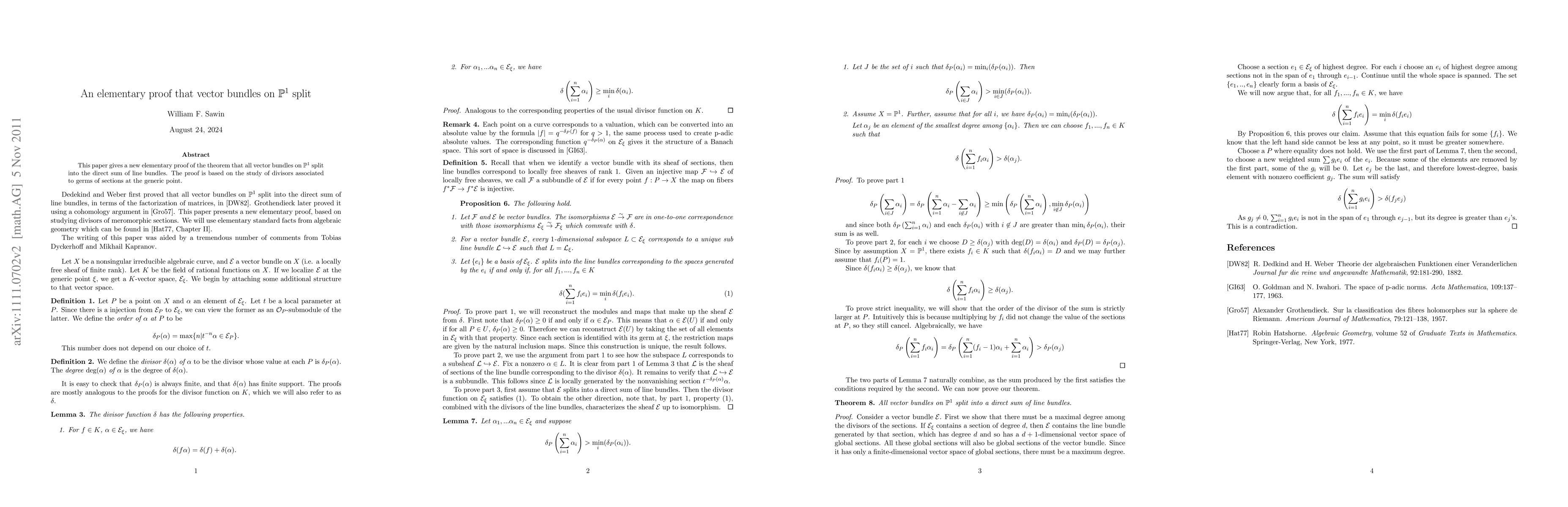 This paper proves that vector bundles on the projective line $b P^1$ can be split into a direct sum of line bundles using the study of divisor theory at the generic point.