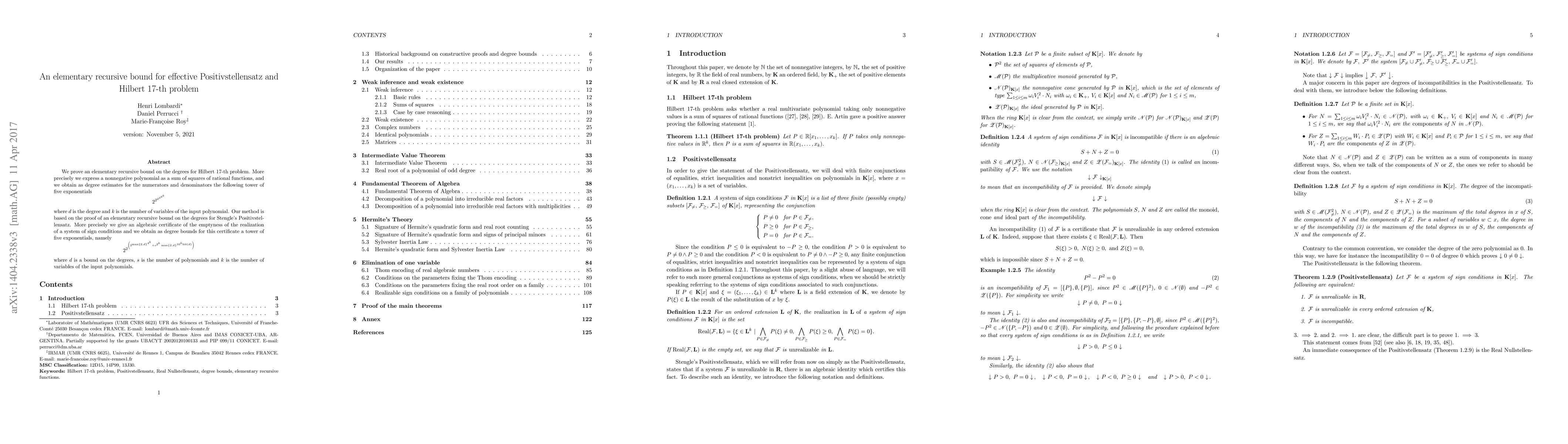 We prove elementary recursive bounds in the degrees for Positivstellensatz and Hilbert 17-th problem, which is the expression of a nonnegative polynomial as a sum of squares of rational functions. We obtain a tower of five exponentials. A precise bound in terms of the number and degree of the polynomials and their number of variables is provided in the paper.