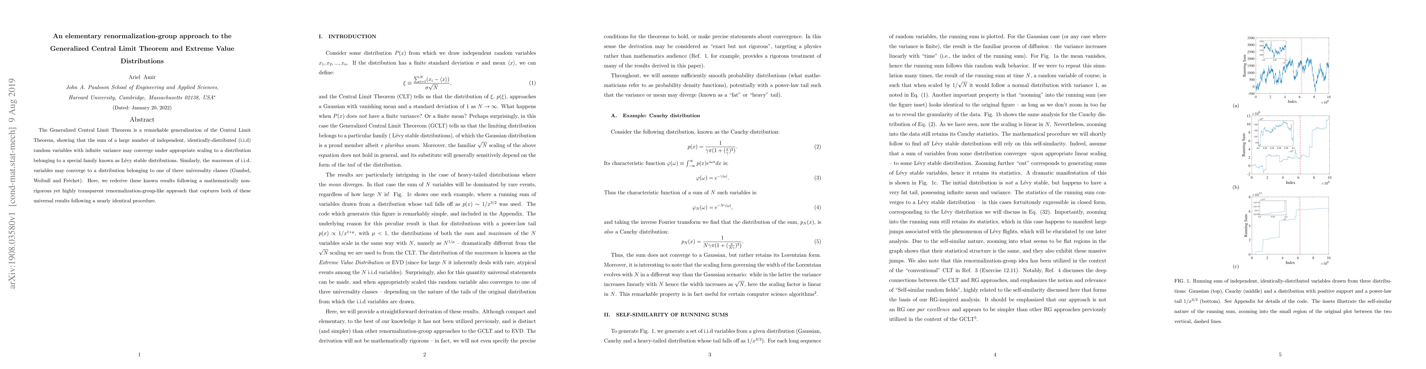 This paper rederives the Generalized Central Limit Theorem and Extreme Value Distributions using a transparent, non-rigorous renormalization-group approach. It demonstrates convergence to Levy stable distributions for sums and to Gumbel, Weibull, and Frechet distributions for maxima of i.i.d. random variables.