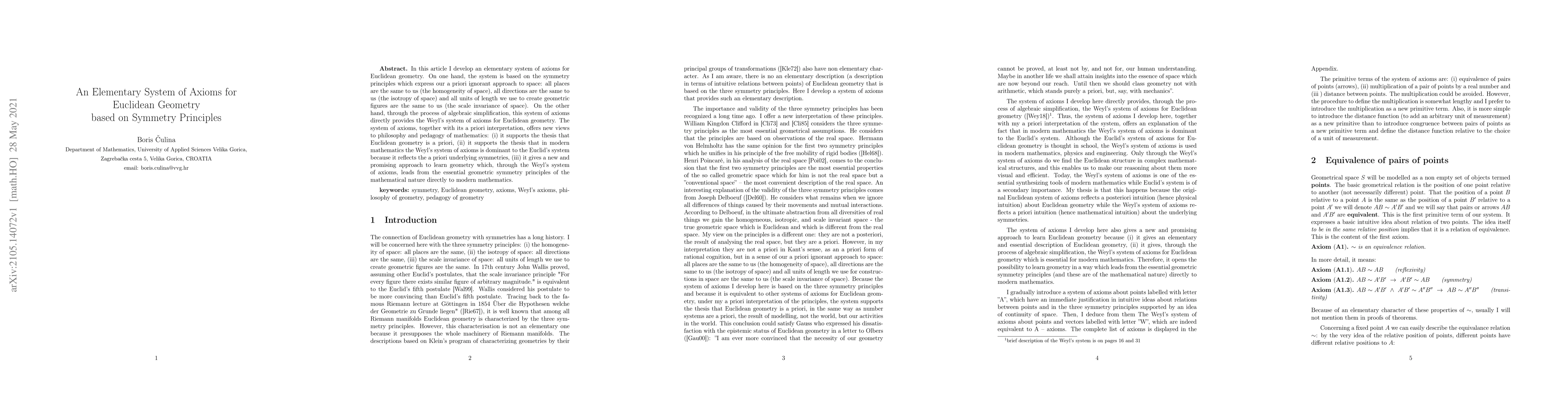 In this article, I develop an elementary system of axioms for Euclidean geometry. On one hand, the system is based on the symmetry principles which express our a priori ignorant approach to space: all places are the same to us (the homogeneity of space), all directions are the same to us (the isotropy of space) and all units of length we use to create geometric figures are the same to us (the scale invariance of space). On the other hand, through the process of algebraic simplification, this system of axioms directly provides Weyl's system of axioms for Euclidean geometry. The system of axioms, together with its a priori interpretation, offers new views to philosophy and pedagogy of mathematics: (i) it supports the thesis that Euclidean geometry is a priori, (ii) it supports the thesis that in modern mathematics the Weyl's system of axioms is dominant to Euclid's system because it reflects the a priori underlying symmetries, (iii) it gives a new and promising approach to learn geometry which, through the Weyl's system of axioms, leads from the essential geometric symmetry principles of the mathematical nature directly to modern mathematics.
