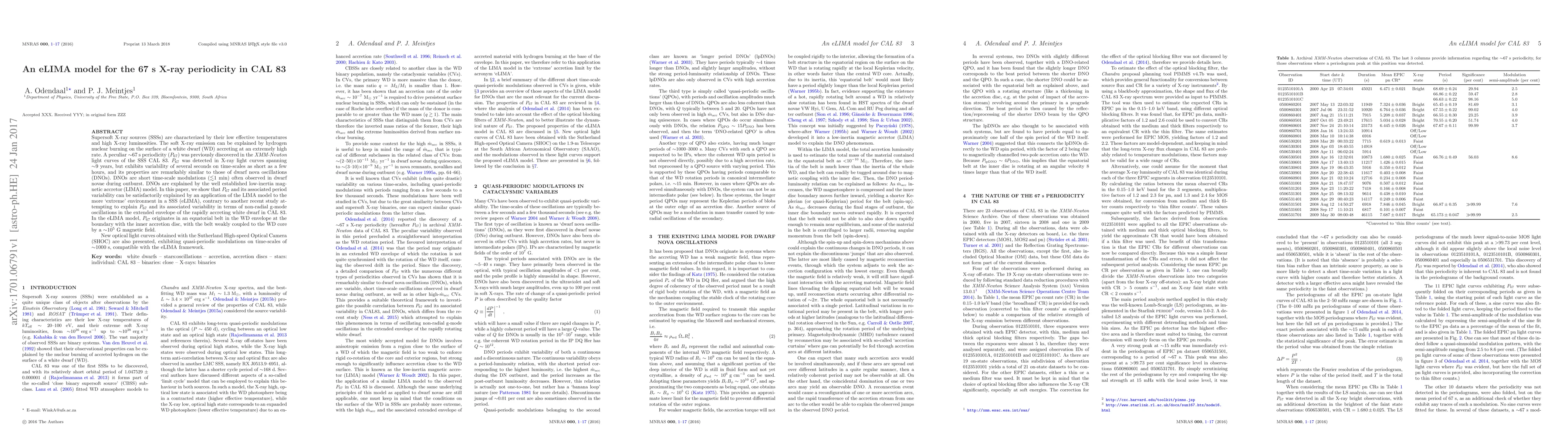 This paper proposes an eLIMA model to explain the 67 s X-ray periodicity (P67) in the supersoft X-ray source CAL 83, attributing it to modulations in an equatorial belt in the white dwarf's envelope. New optical light curves support the model's predictions of quasi-periodic modulations.