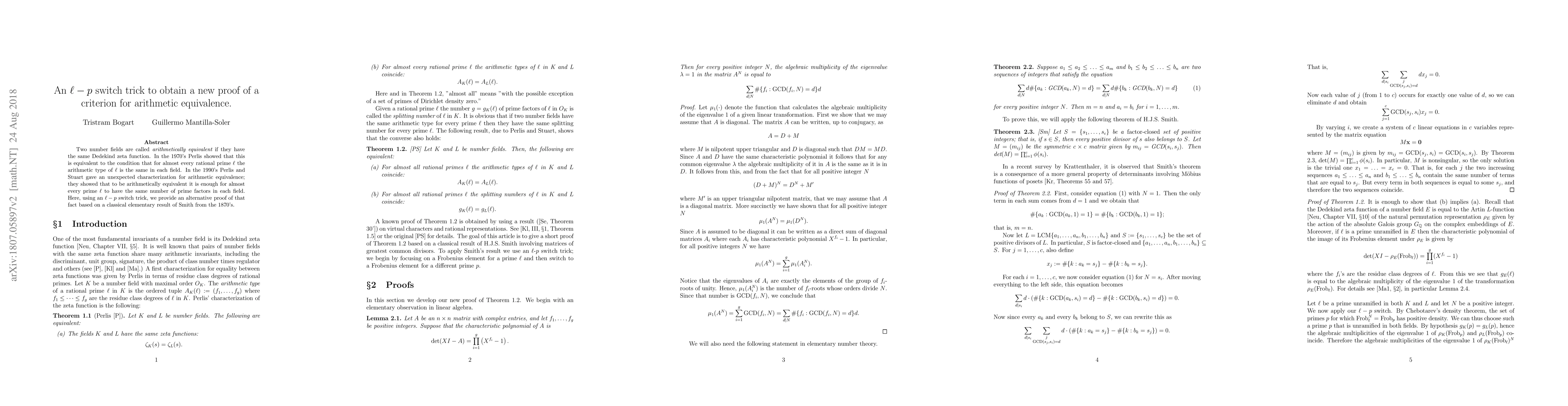 Two number fields are called arithmetically equivalent if they have the same Dedekind zeta function. In the 1970's Perlis showed that this is equivalent to the condition that for almost every rational prime $\ell$ the arithmetic type of $\ell$ is the same in each field. In the 1990's Perlis and Stuart gave an unexpected characterization for arithmetic equivalence; they showed that to be arithmetically equivalent it is enough for almost every prime $\ell$ to have the same number of prime factors in each field. Here, using an $\ell-p$ switch trick, we provide an elementary proof of that fact based on a classical result of Smith from the 1870's.