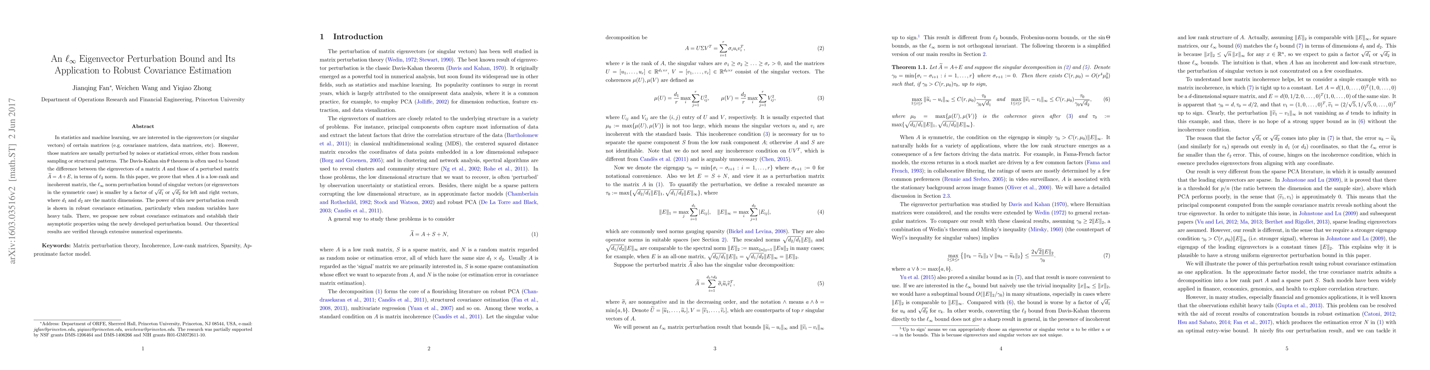 This paper establishes a new $\ell_{\infty}$ perturbation bound for eigenvectors of low-rank and incoherent matrices, showing it is more effective than $\ell_2$ bounds. The result is applied to robust covariance estimation, proposing new estimators for heavy-tailed data and verifying their effectiveness through numerical experiments.
