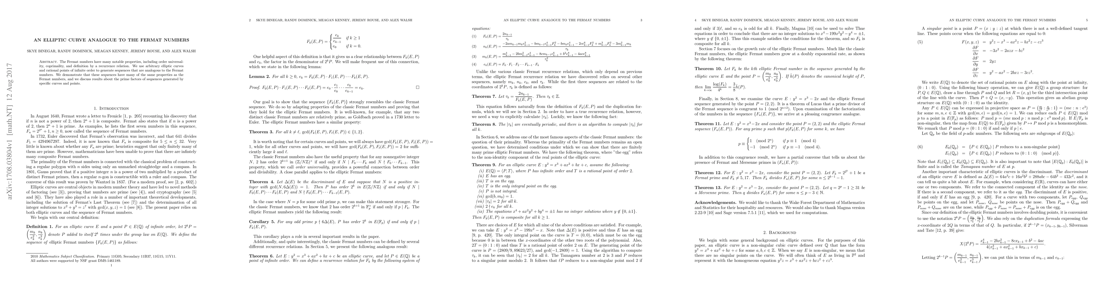 This paper explores an elliptic curve analogue to Fermat numbers, generating sequences with properties similar to Fermat numbers, including order universality and coprimality, and investigates the prime factors of these sequences based on specific curves and rational points.