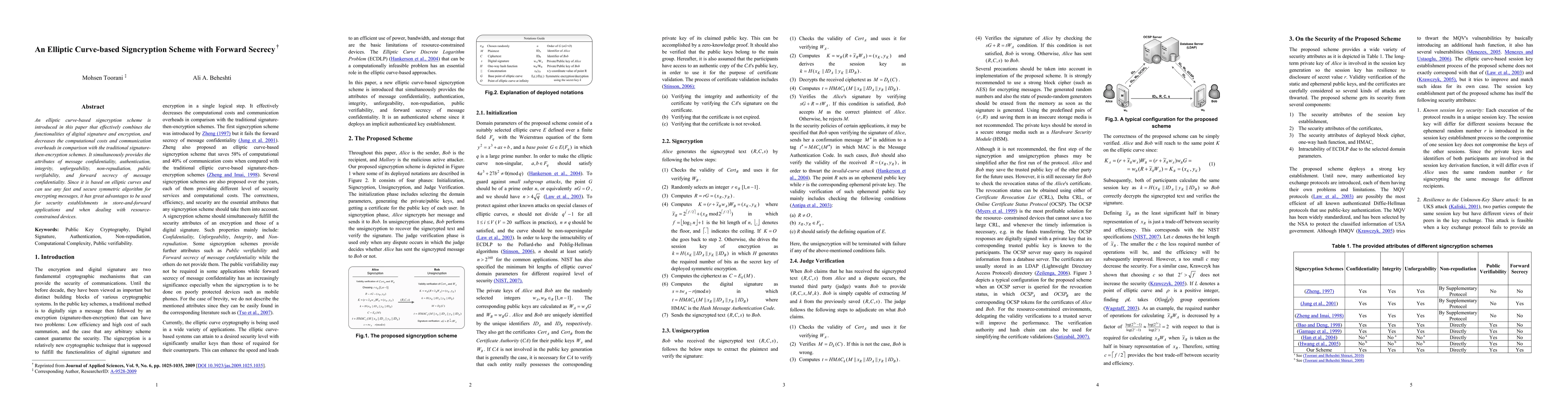 This paper proposes an elliptic curve-based signcryption scheme that merges digital signature and encryption to enhance efficiency and security, offering forward secrecy, confidentiality, and authentication for resource-constrained environments. It leverages the benefits of elliptic curves and flexible symmetric encryption algorithms.