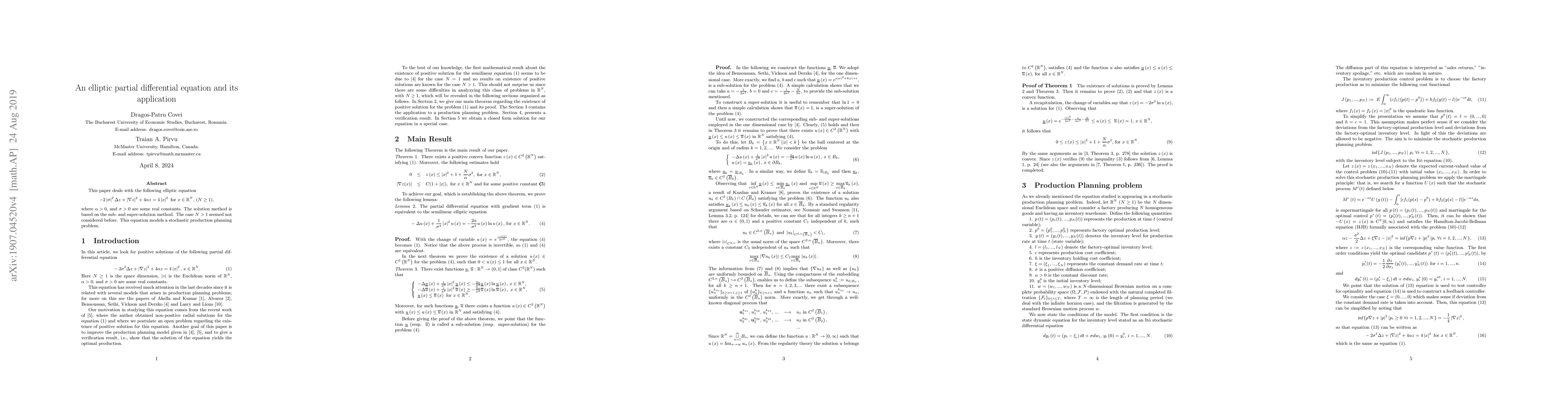 This paper deals with the following elliptic equation \begin{equation*} -2\sigma^{2}\Delta z+\left\| \nabla z\right\| ^{2}+4\alpha z=4\left\| x\right\| ^{2}\text{ for }x\in \mathbb{R}^{N}\text{, (}% N\geq 1\text{),} \end{equation*}% where $\alpha >0,$ $\sigma>0$ are some real parameters. The solution method is based on the sub- and super-solutions approach. The case $N>1$ seemed not considered before. This equation models a stochastic production planning problem.