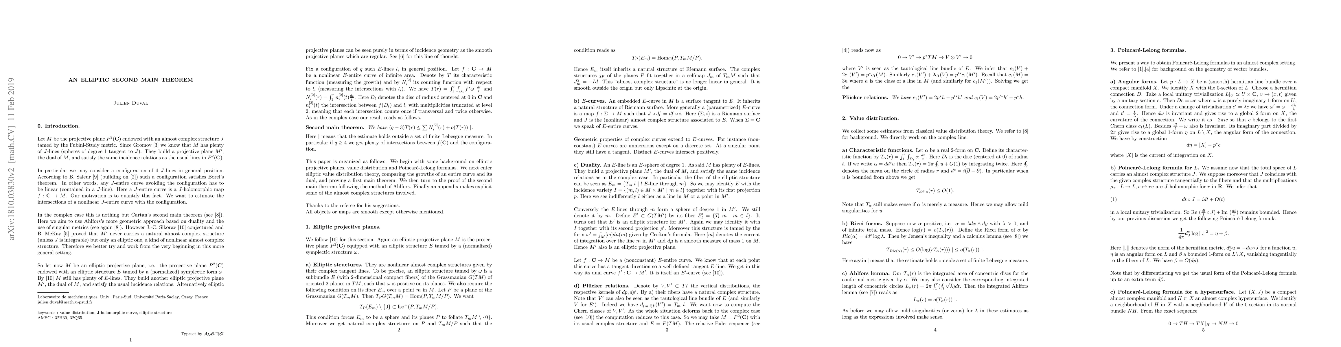 Summary: This paper establishes a second main theorem for elliptic projective planes, extending the classical second main theorem to this specific geometric context. The result provides new insights into the distribution of values of meromorphic maps in elliptic geometry.