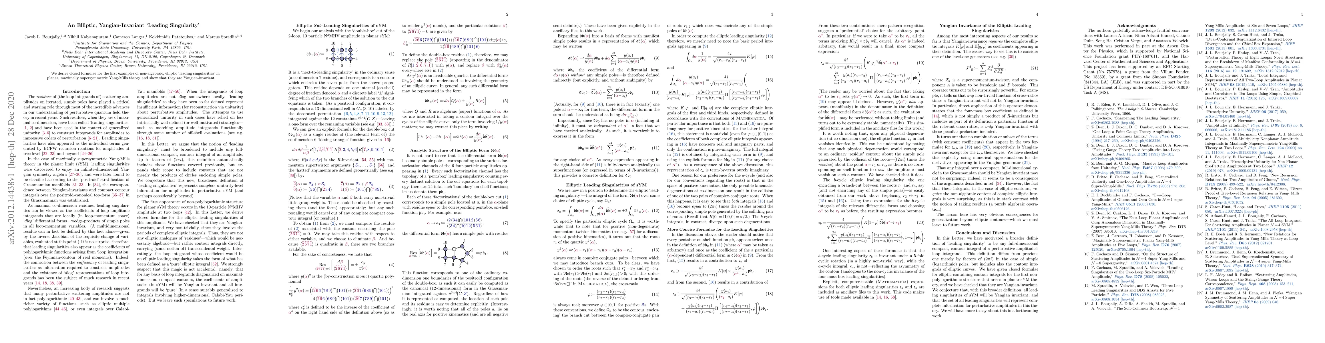 This research derives explicit formulae for non-algebraic, elliptic 'leading singularities' in planar, maximally supersymmetric Yang-Mills theory, demonstrating their Yangian-invariance for the first time.