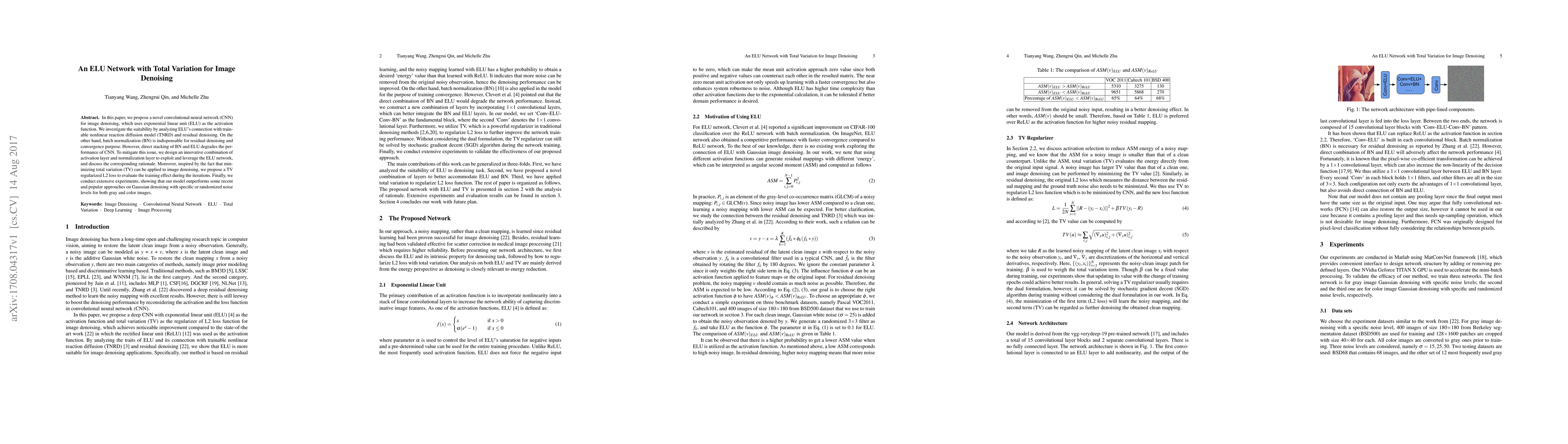 A new image denoising model using exponential linear unit (ELU) activation functions and total variation regularization improves upon existing methods with promising results on both gray and color images.