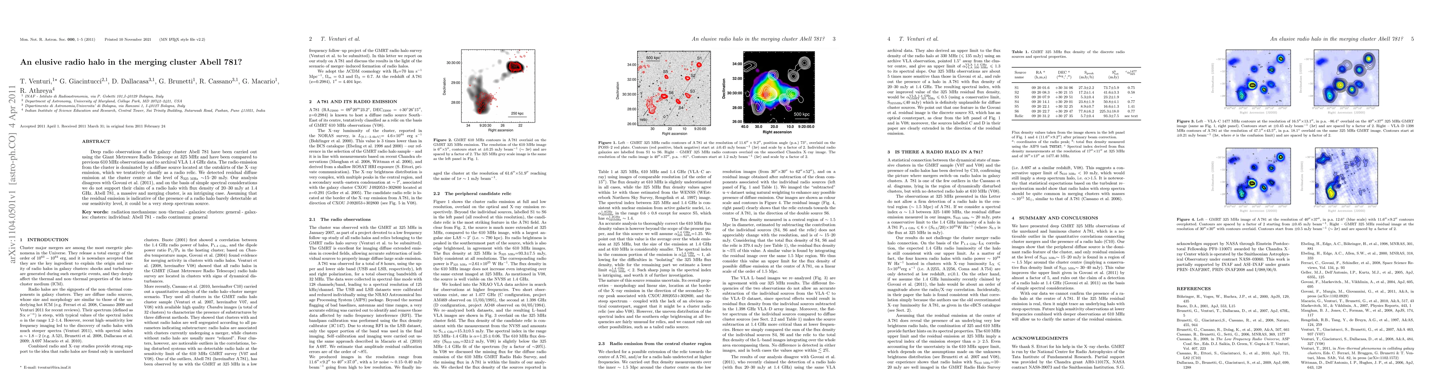 This study uses the Giant Metrewave Radio Telescope to detect elusive radio emissions in the merging cluster Abell 781, finding a diffuse source tentatively classified as a radio relic, while disagreeing with previous claims of a detectable radio halo. The residual emission at the cluster center suggests a possible, but barely detectable, radio halo.