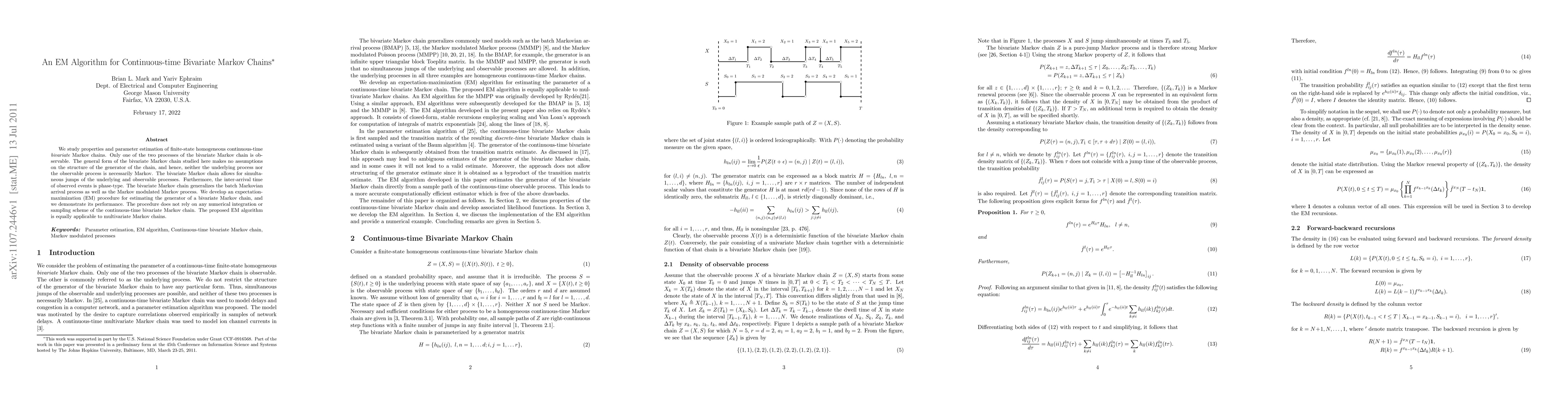 We study properties and parameter estimation of finite-state homogeneous continuous-time bivariate Markov chains. Only one of the two processes of the bivariate Markov chain is observable. The general form of the bivariate Markov chain studied here makes no assumptions on the structure of the generator of the chain, and hence, neither the underlying process nor the observable process is necessarily Markov. The bivariate Markov chain allows for simultaneous jumps of the underlying and observable processes. Furthermore, the inter-arrival time of observed events is phase-type. The bivariate Markov chain generalizes the batch Markovian arrival process as well as the Markov modulated Markov process. We develop an expectation-maximization (EM) procedure for estimating the generator of a bivariate Markov chain, and we demonstrate its performance. The procedure does not rely on any numerical integration or sampling scheme of the continuous-time bivariate Markov chain. The proposed EM algorithm is equally applicable to multivariate Markov chains.
