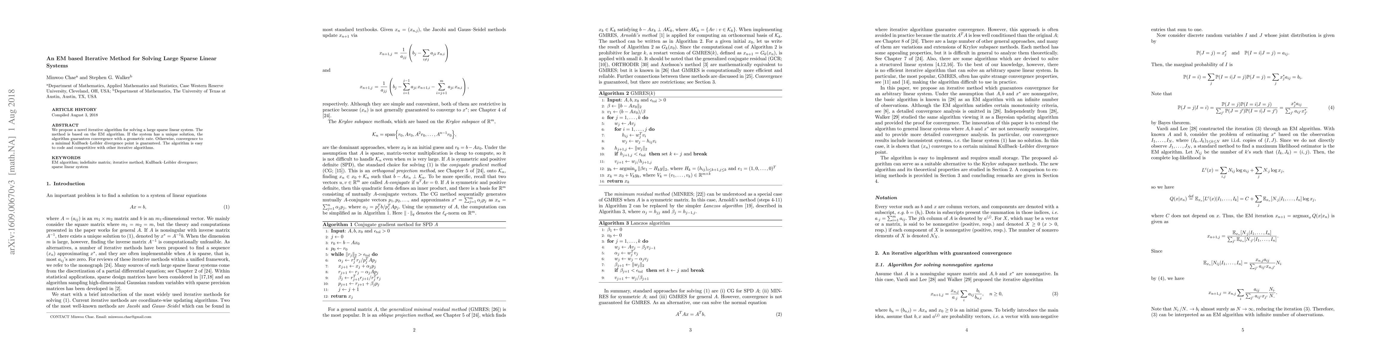 This paper introduces an EM-based iterative method for solving large sparse linear systems, ensuring convergence with a geometric rate if a unique solution exists or to a minimal Kullback-Leibler divergence point otherwise. The algorithm is straightforward to implement and performs competitively with other iterative methods.