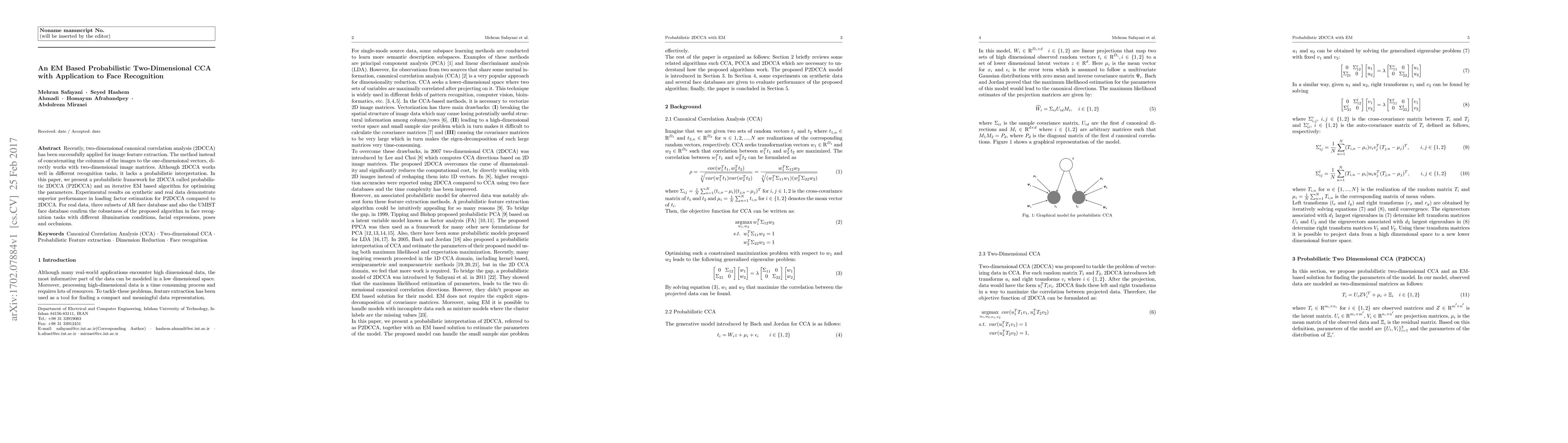 A new probabilistic framework for 2DCCA is presented, offering superior performance in face recognition tasks with varying conditions, and an iterative EM-based algorithm for optimizing parameters.