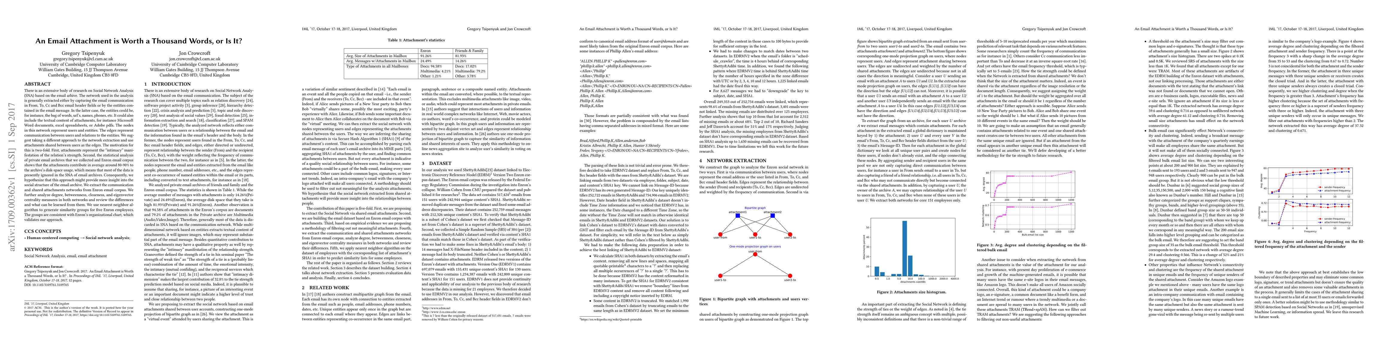 There is an extensive body of research on Social Network Analysis (SNA) based on the email archive. The network used in the analysis is generally extracted either by capturing the email communication in From, To, Cc and Bcc email header fields or by the entities contained in the email message. In the latter case, the entities could be, for instance, the bag of words, url's, names, phones, etc. It could also include the textual content of attachments, for instance Microsoft Word documents, excel spreadsheets, or Adobe pdfs. The nodes in this network represent users and entities. The edges represent communication between users and relations to the entities. We suggest taking a different approach to the network extraction and use attachments shared between users as the edges. The motivation for this is two-fold. First, attachments represent the "intimacy" manifestation of the relation's strength. Second, the statistical analysis of private email archives that we collected and Enron email corpus shows that the attachments contribute in average around 80-90% to the archive's disk-space usage, which means that most of the data is presently ignored in the SNA of email archives. Consequently, we hypothesize that this approach might provide more insight into the social structure of the email archive. We extract the communication and shared attachments networks from Enron email corpus. We further analyze degree, betweenness, closeness, and eigenvector centrality measures in both networks and review the differences and what can be learned from them. We use nearest neighbor algorithm to generate similarity groups for five Enron employees. The groups are consistent with Enron's organizational chart, which validates our approach.