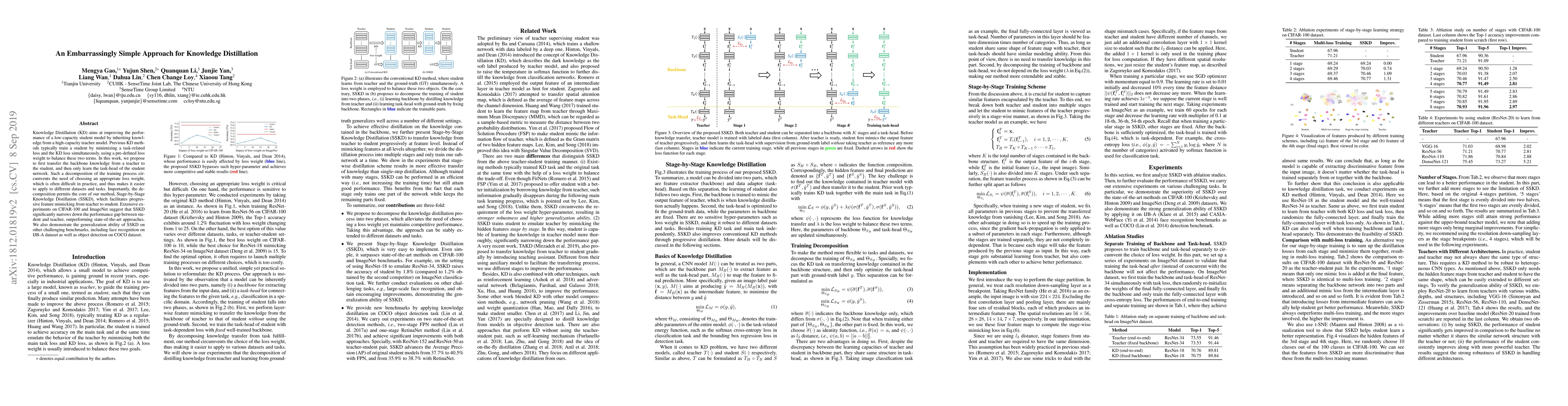 Knowledge Distillation (KD) aims at improving the performance of a low-capacity student model by inheriting knowledge from a high-capacity teacher model. Previous KD methods typically train a student by minimizing a task-related loss and the KD loss simultaneously, using a pre-defined loss weight to balance these two terms. In this work, we propose to first transfer the backbone knowledge from a teacher to the student, and then only learn the task-head of the student network. Such a decomposition of the training process circumvents the need of choosing an appropriate loss weight, which is often difficult in practice, and thus makes it easier to apply to different datasets and tasks. Importantly, the decomposition permits the core of our method, Stage-by-Stage Knowledge Distillation (SSKD), which facilitates progressive feature mimicking from teacher to student. Extensive experiments on CIFAR-100 and ImageNet suggest that SSKD significantly narrows down the performance gap between student and teacher, outperforming state-of-the-art approaches. We also demonstrate the generalization ability of SSKD on other challenging benchmarks, including face recognition on IJB-A dataset as well as object detection on COCO dataset.