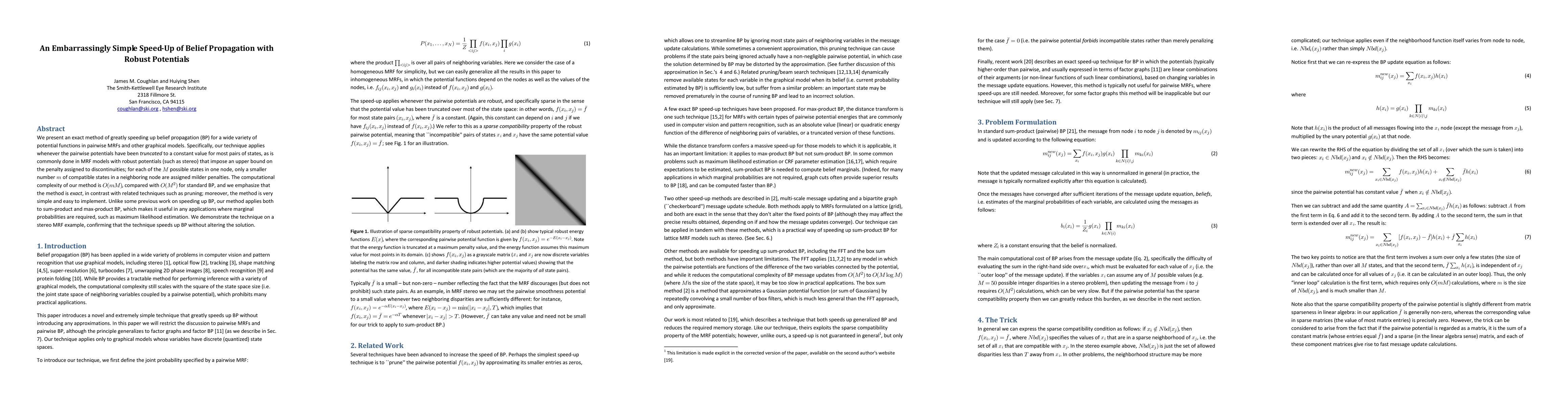 We present an exact method of greatly speeding up belief propagation (BP) for a wide variety of potential functions in pairwise MRFs and other graphical models. Specifically, our technique applies whenever the pairwise potentials have been {\em truncated} to a constant value for most pairs of states, as is commonly done in MRF models with robust potentials (such as stereo) that impose an upper bound on the penalty assigned to discontinuities; for each of the $M$ possible states in one node, only a smaller number $m$ of compatible states in a neighboring node are assigned milder penalties. The computational complexity of our method is $O(mM)$, compared with $O(M^2)$ for standard BP, and we emphasize that the method is {\em exact}, in contrast with related techniques such as pruning; moreover, the method is very simple and easy to implement. Unlike some previous work on speeding up BP, our method applies both to sum-product and max-product BP, which makes it useful in any applications where marginal probabilities are required, such as maximum likelihood estimation. We demonstrate the technique on a stereo MRF example, confirming that the technique speeds up BP without altering the solution.