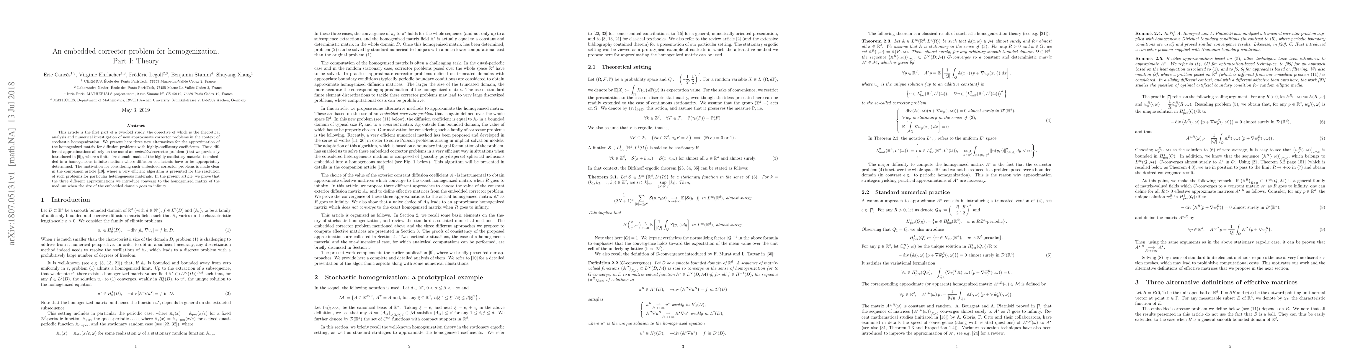 This article is the first part of a two-fold study, the objective of which is the theoretical analysis and numerical investigation of new approximate corrector problems in the context of stochastic homogenization. We present here three new alternatives for the approximation of the homogenized matrix for diffusion problems with highly-oscillatory coefficients. These different approximations all rely on the use of an embedded corrector problem (that we previously introduced in [Canc\`es, Ehrlacher, Legoll and Stamm, C. R. Acad. Sci. Paris, 2015]), where a finite-size domain made of the highly oscillatory material is embedded in a homogeneous infinite medium whose diffusion coefficients have to be appropriately determined. The motivation for considering such embedded corrector problems is made clear in the companion article [Canc\`es, Ehrlacher, Legoll, Stamm and Xiang, in preparation], where a very efficient algorithm is presented for the resolution of such problems for particular heterogeneous materials. In the present article, we prove that the three different approximations we introduce converge to the homogenized matrix of the medium when the size of the embedded domain goes to infinity.