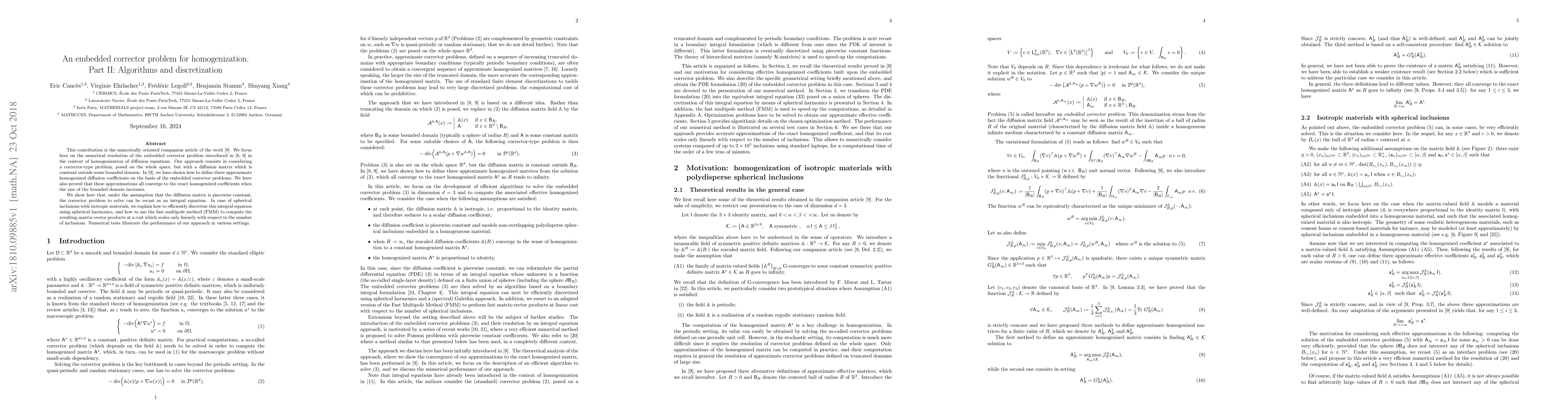 This paper presents numerical algorithms and discretization techniques for solving the embedded corrector problem in the context of homogenization of diffusion equations. It recasts the corrector problem as an integral equation and efficiently discretizes it using spherical harmonics and the fast multipole method, demonstrating linear scaling with the number of inclusions and validating the approach with numerical tests.