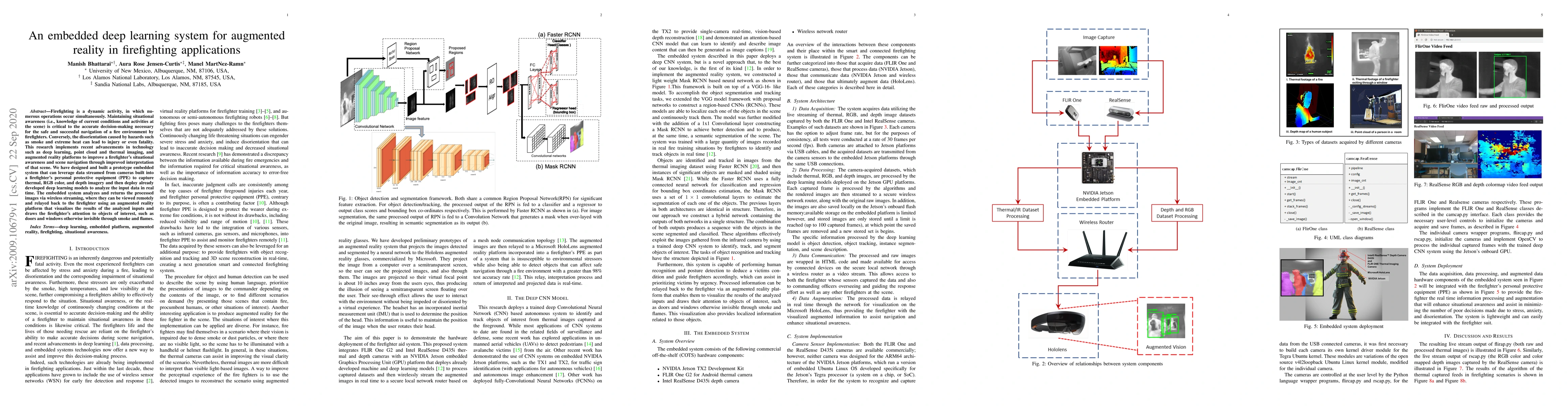 This research develops an embedded deep learning system for augmented reality to enhance firefighters' situational awareness in dynamic fire environments. The system processes thermal, RGB, and depth imagery from firefighter PPE, analyzes data in real time, and visualizes critical scene elements via augmented reality to aid navigation.
