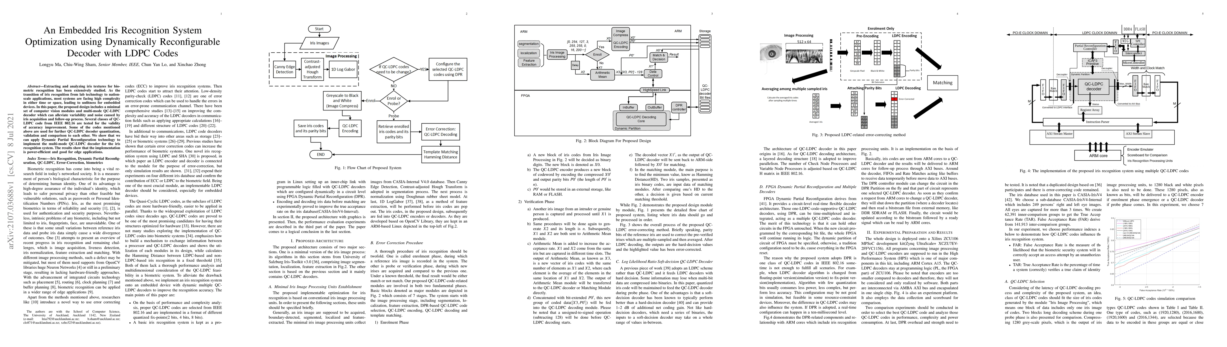 This paper proposes an optimized embedded iris recognition system using a dynamically reconfigurable decoder with LDPC codes to reduce complexity and improve accuracy. The study demonstrates the effectiveness of QC-LDPC codes and Dynamic Partial Reconfiguration technology, showing improved power efficiency suitable for edge applications.