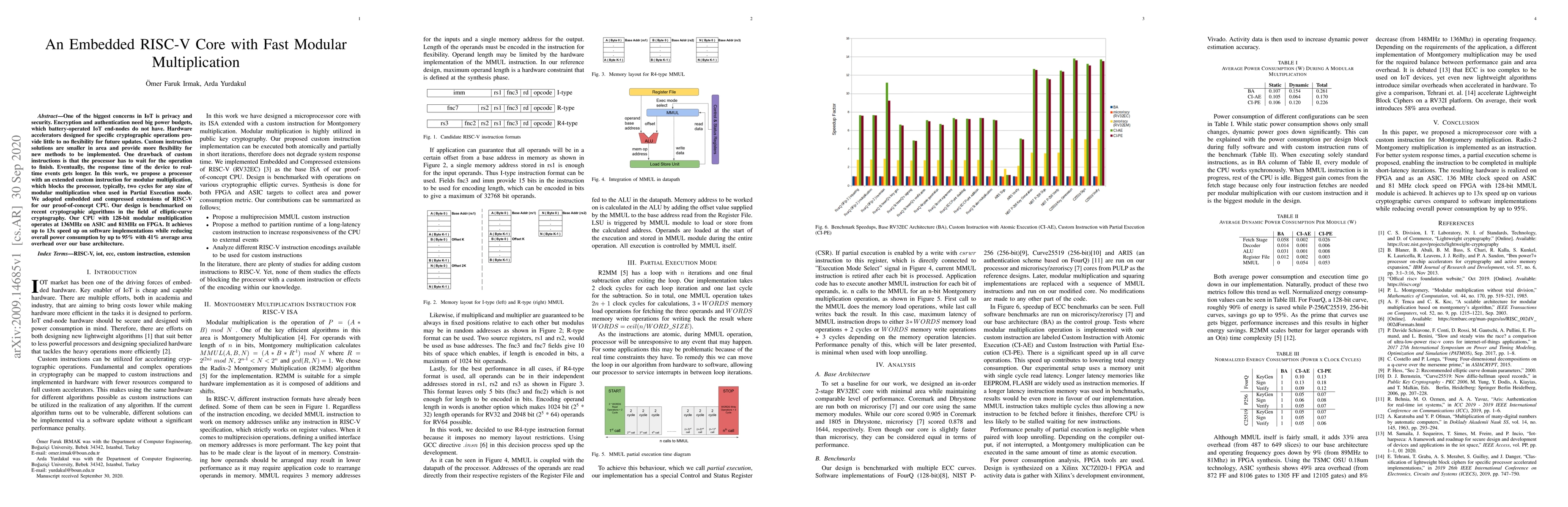The main technical contribution is the proposal of a multiprecision MMUL custom instruction and a method to partition the runtime of a long-latency custom instruction to increase CPU responsiveness to external events.