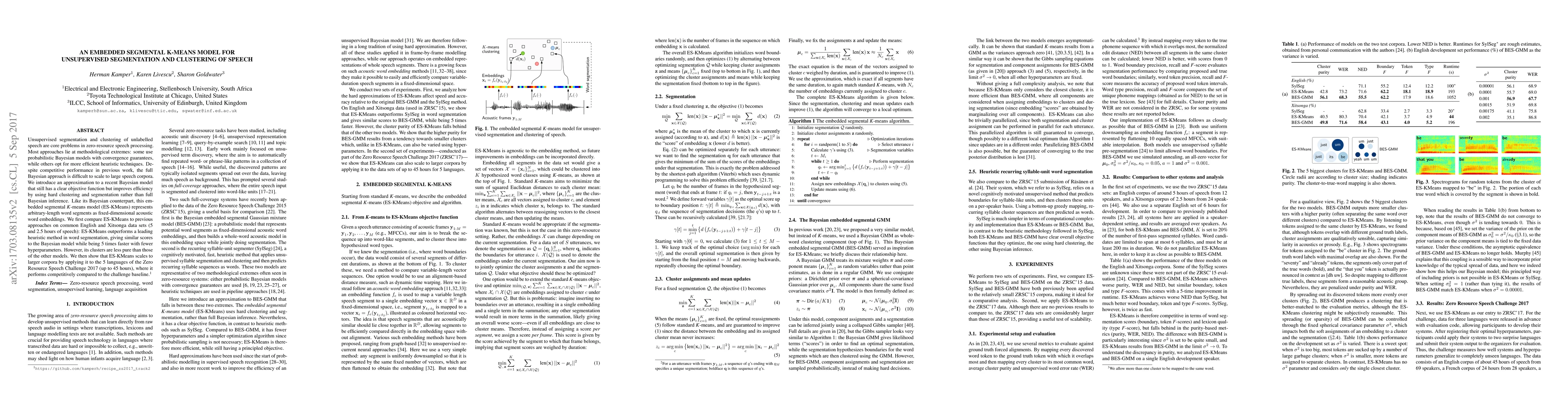 This paper introduces an embedded segmental K-means model (ES-KMeans) for efficient unsupervised segmentation and clustering of unlabelled speech, achieving better performance than heuristic methods while being significantly faster and requiring fewer hyperparameters. The model scales well to larger corpora, performing competitively on multiple languages.