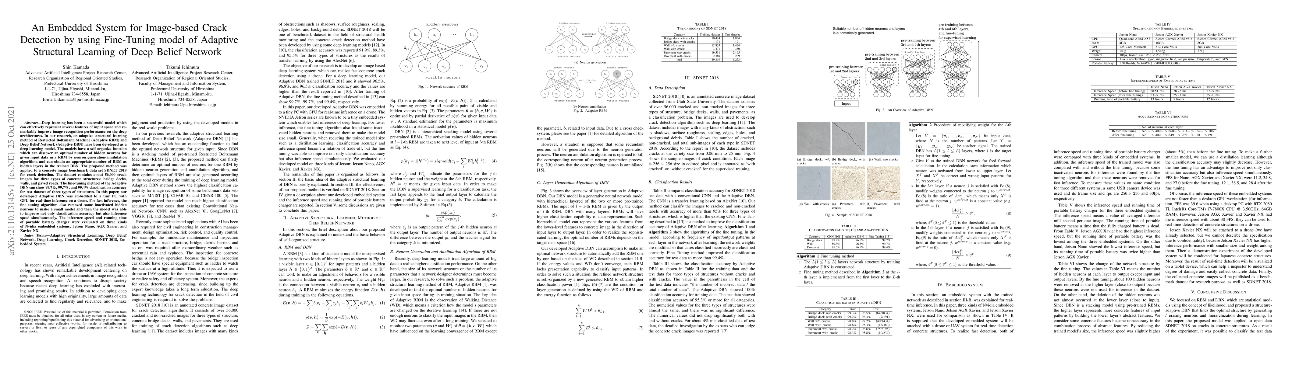 Deep learning has been a successful model which can effectively represent several features of input space and remarkably improve image recognition performance on the deep architectures. In our research, an adaptive structural learning method of Restricted Boltzmann Machine (Adaptive RBM) and Deep Belief Network (Adaptive DBN) have been developed as a deep learning model. The models have a self-organize function which can discover an optimal number of hidden neurons for given input data in a RBM by neuron generation-annihilation algorithm, and can obtain an appropriate number of RBM as hidden layers in the trained DBN. The proposed method was applied to a concrete image benchmark data set SDNET 2018 for crack detection. The dataset contains about 56,000 crack images for three types of concrete structures: bridge decks, walls, and paved roads. The fine-tuning method of the Adaptive DBN can show 99.7%, 99.7%, and 99.4% classification accuracy for test dataset of three types of structures. In this paper, our developed Adaptive DBN was embedded to a tiny PC with GPU for real-time inference on a drone. For fast inference, the fine tuning algorithm also removed some inactivated hidden neurons to make a small model and then the model was able to improve not only classification accuracy but also inference speed simultaneously. The inference speed and running time of portable battery charger were evaluated on three kinds of Nvidia embedded systems; Jetson Nano, AGX Xavier, and Xavier NX.