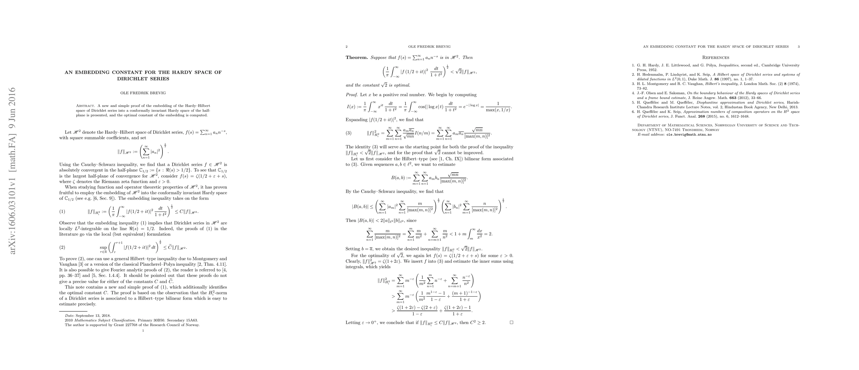 A new proof is presented for embedding the Hardy-Hilbert space of Dirichlet series into a conformally invariant Hardy space, with an optimal constant computed.